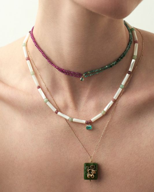 Colar Pastille em Ouro 18K com Madrepérolas e Esmeralda