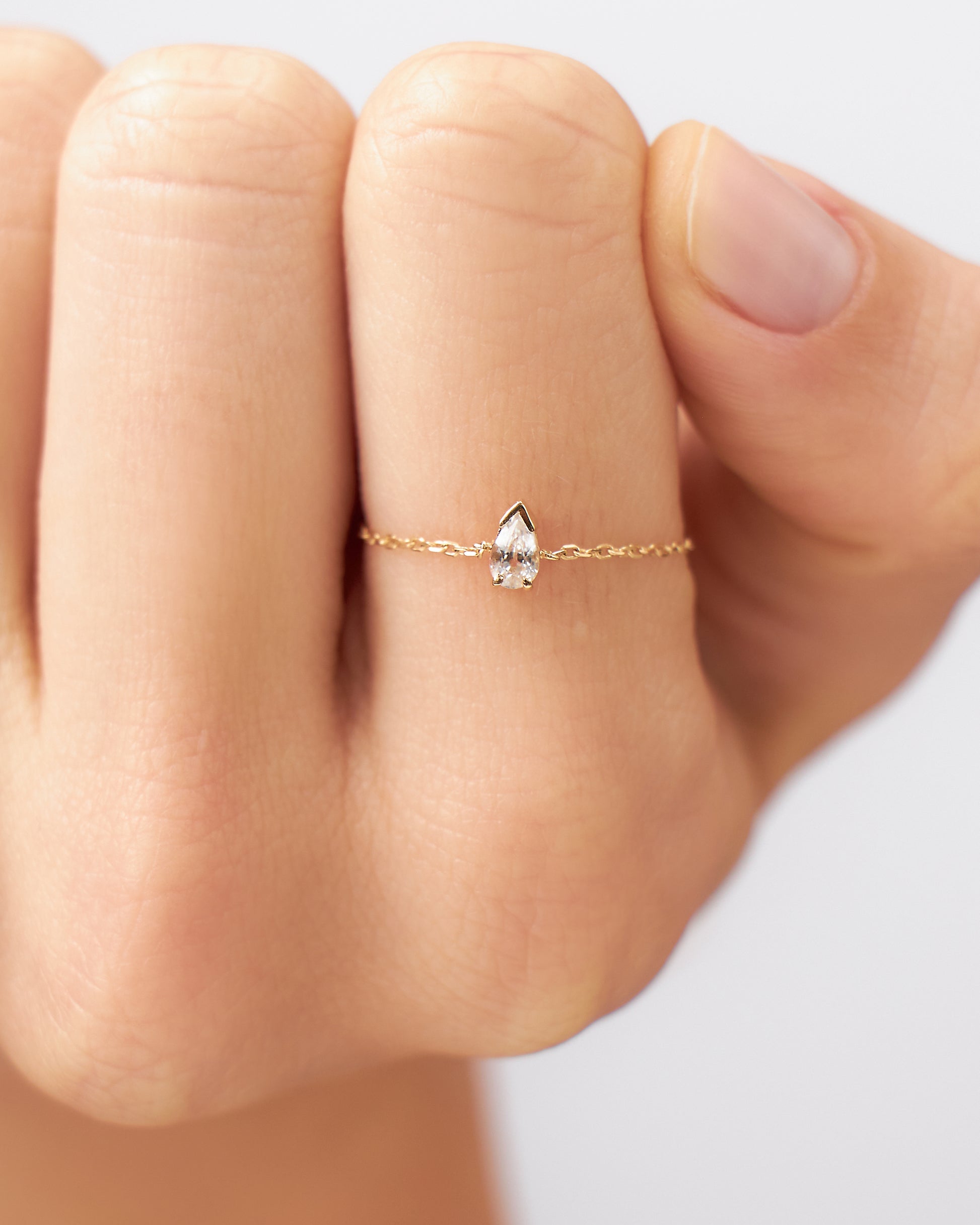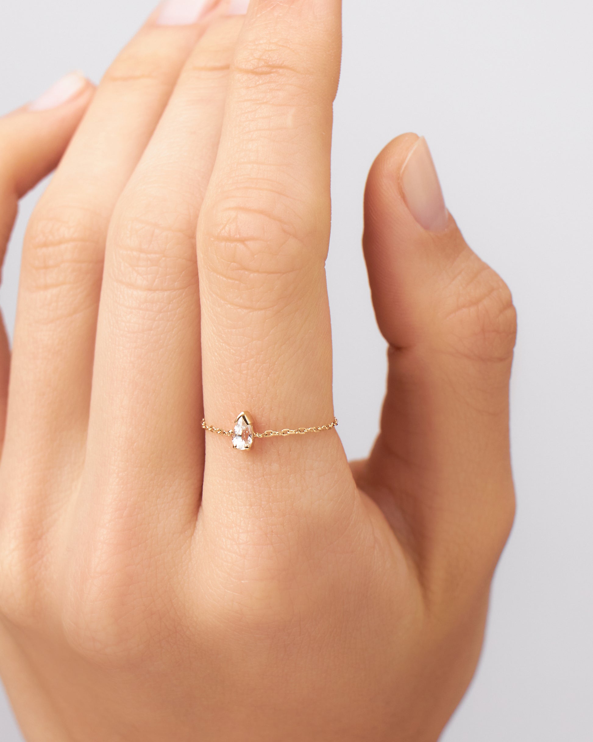 O Anel Corrente Gota Safira Branca é confeccionado em Ouro Amarelo 18K. Todas sua extensão é composta por uma corrente de elos finos. A Safira Branca em gota ao centro possui 3x5mm.