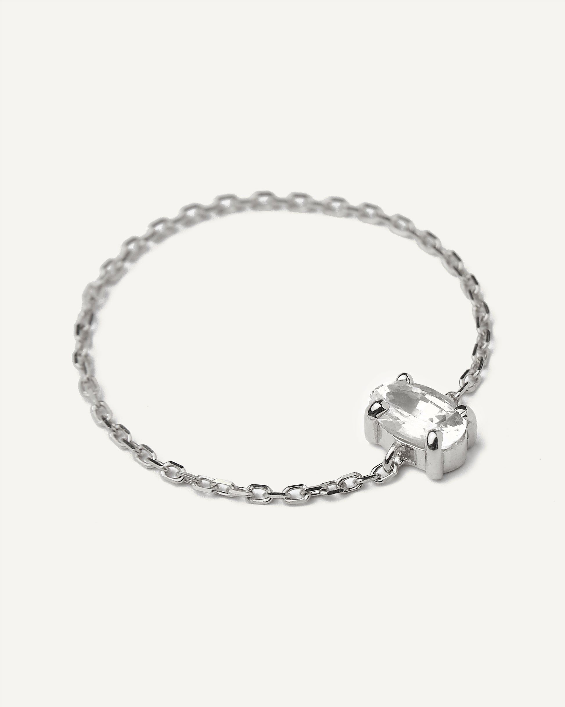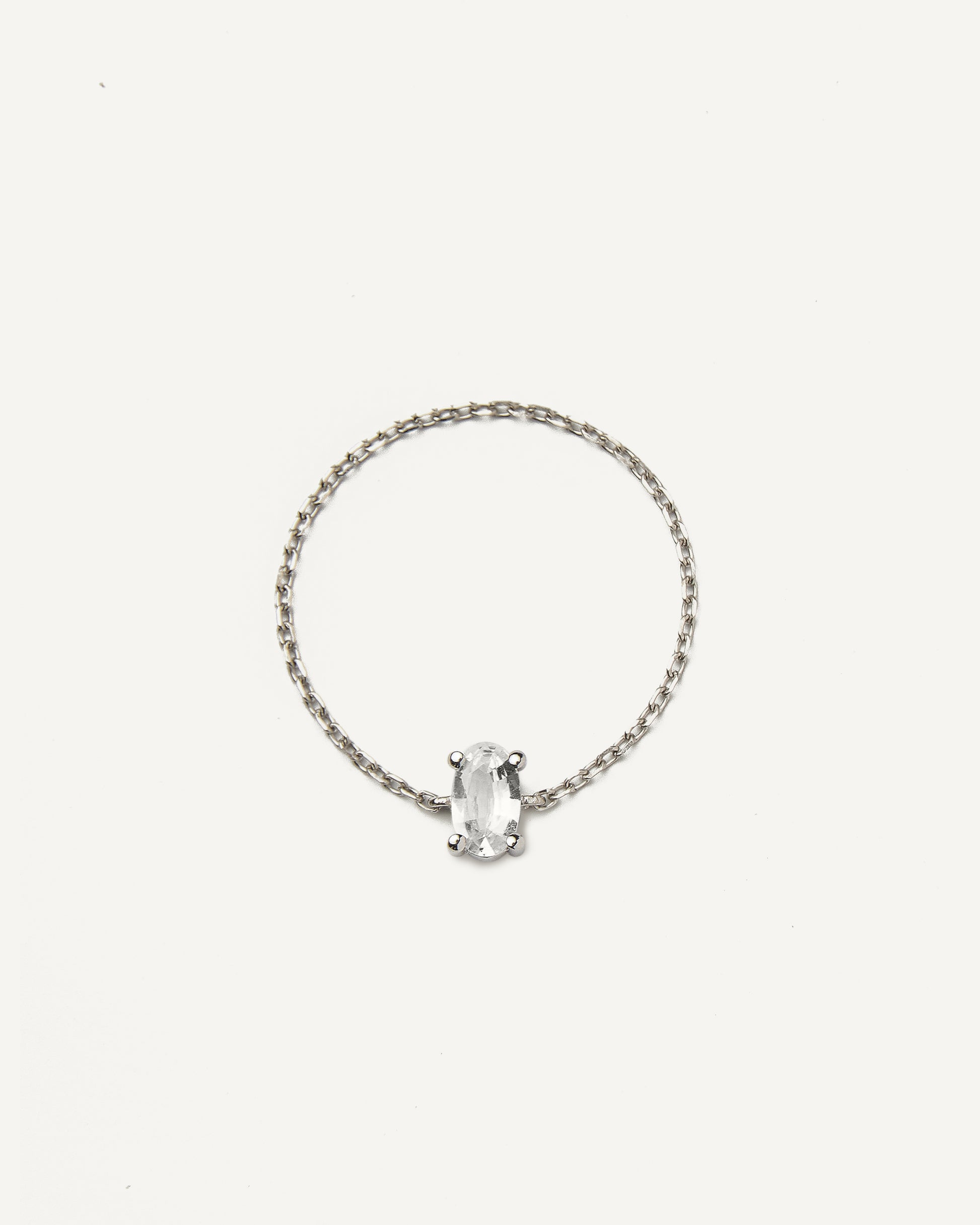 O Anel Corrente Oval Safira Branca é confeccionado em Ouro Branco 18K. Todas sua extensão é composta por uma corrente de elos finos. A Safira Branca oval ao centro possui 3x5mm.