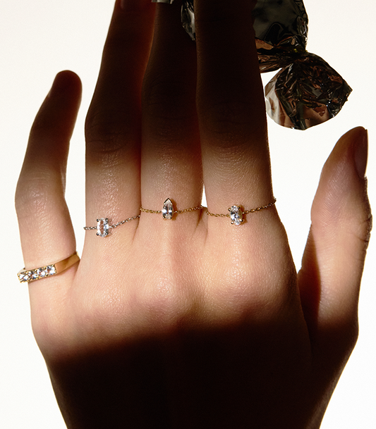 • Anel Corrente Gota em Ouro Amarelo 18K e Safira Branca