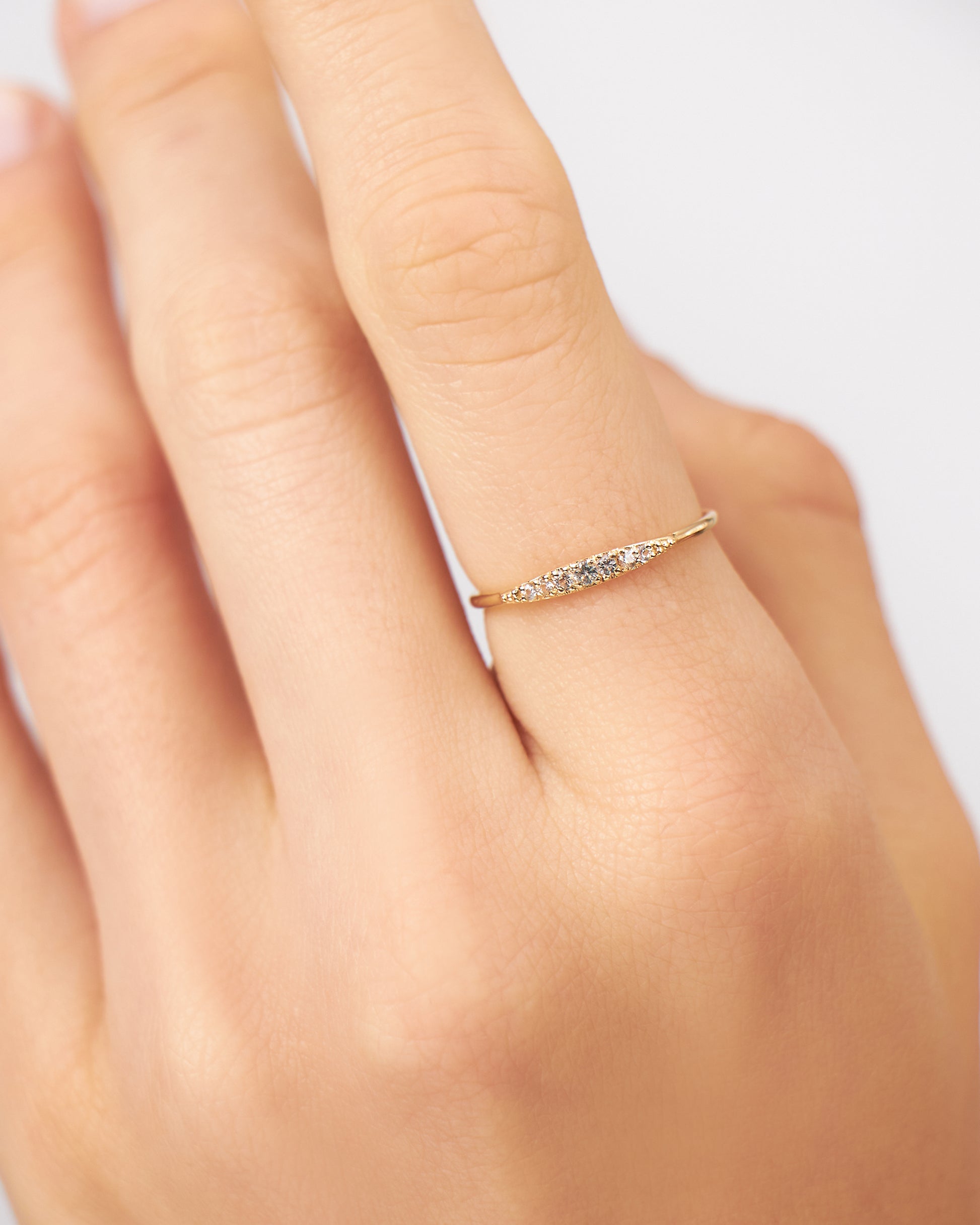 O Anel Disco é confeccionado em Ouro Amarelo 18k e Safiras Brancas de 1,2mm, 1,3mm, 1,5mm e 1,7mm.
