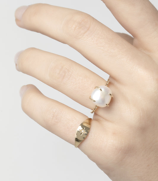 O Anel Meteoro é confeccionado em Ouro Amarelo 18K com Pérola Barroca Branca de aproximadamente 10x11mm e Brilhantes Champanhe de 1,1mm.
