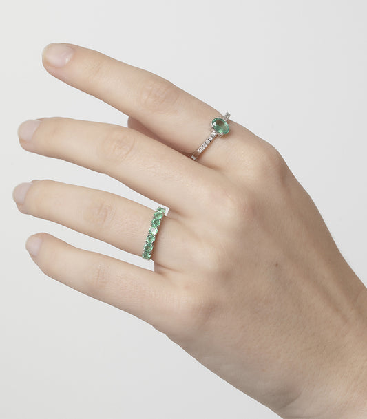 O Anel Isadora é confeccionado em Ouro Branco 18k, com Esmeralda oval (5x7mm) de 0,8 quilates, e Diamantes de 1 ponto, ao todo, são 12 pontos de diamante.