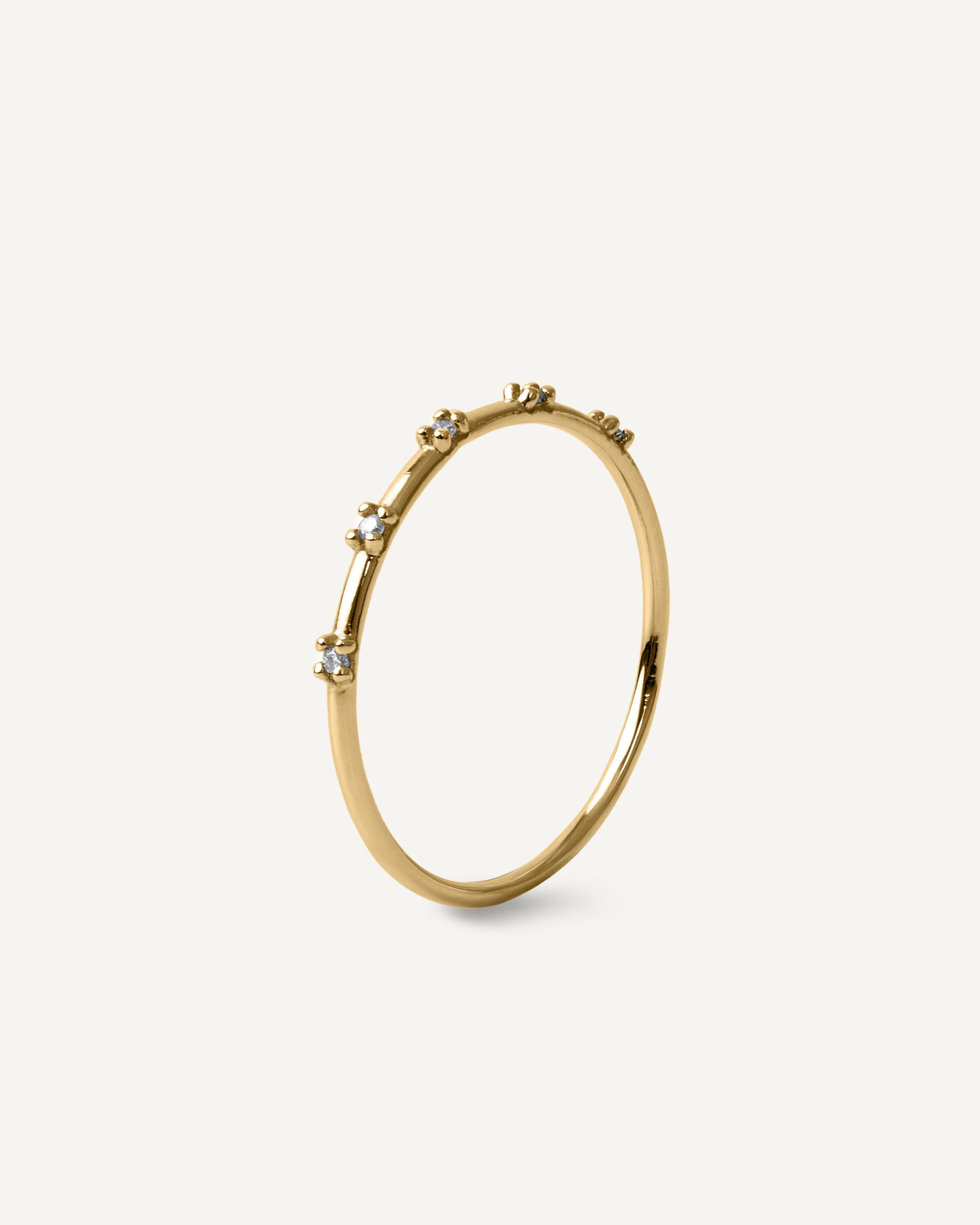 O Anel Twig é confeccionado em Ouro Amarelo 18k e possui cinco pedras de Diamante Branco de 0,5 ponto cada.