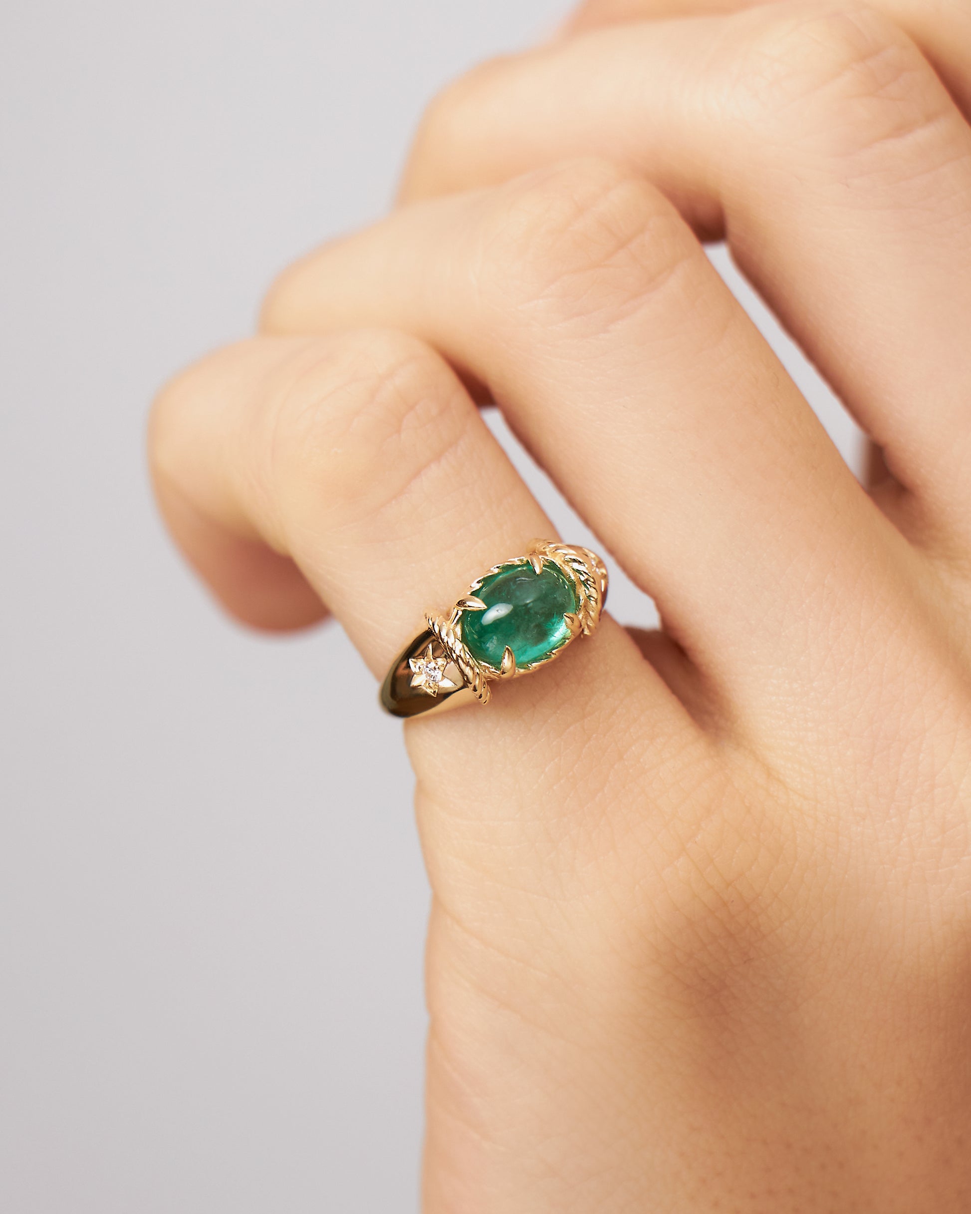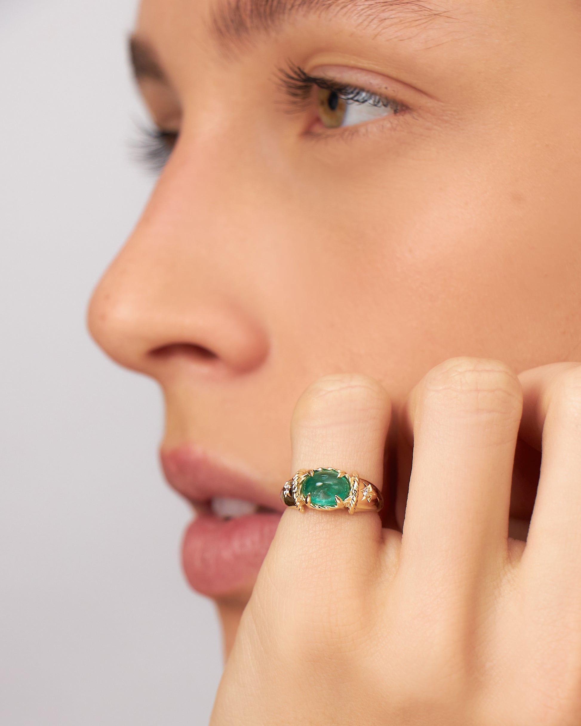 O Anel Vênus é confeccionado em Ouro Amarelo 18K e um cabochão de Esmeralda de 6x8mm e 2 Diamantes Brancos de 1,5 ponto cada.