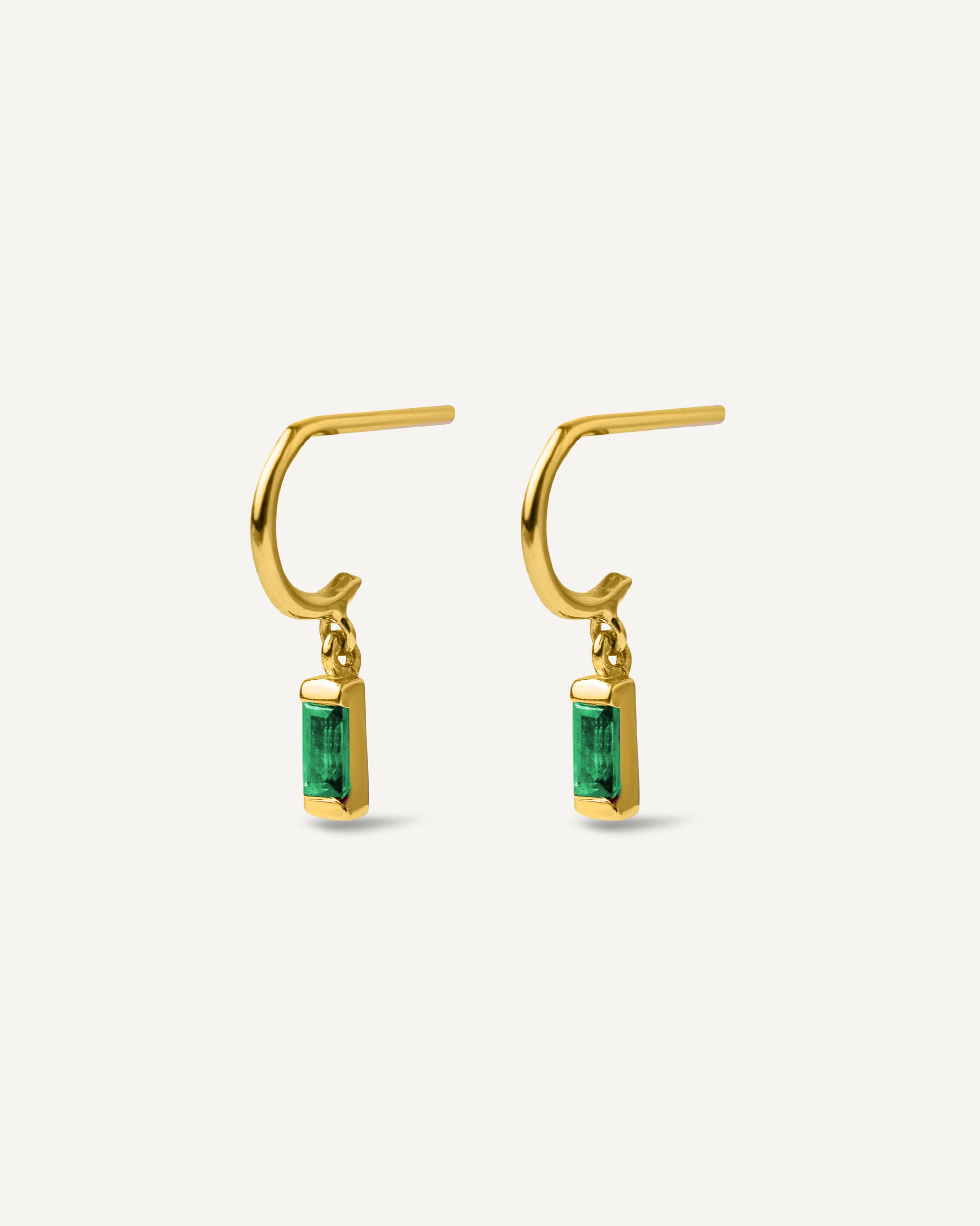 A Argola Charlotte Esmeralda é confeccionada em Ouro Amarelo 18K com baguetes de Esmeralda de 2x4mm. O comprimento total da peça (contando com a argola) é de 16mm.