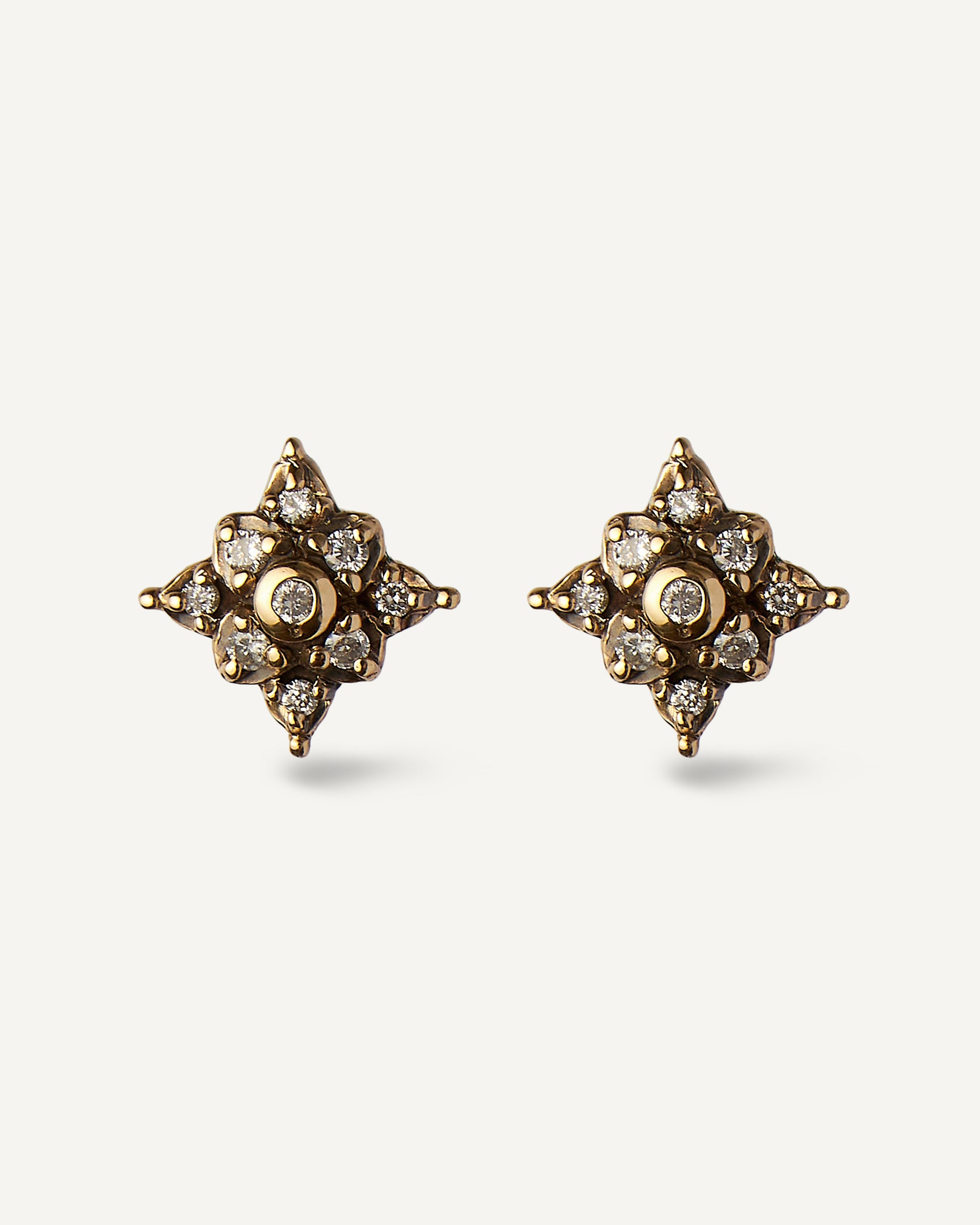 O Brinco Antico é confeccionado em Ouro Amarelo 18K e cada pé possui cinco Diamantes Brancos de 1 ponto e quatro de 0,5 ponto. A peça tem detalhes em ródio negro e aproximadamente 9x9mm.