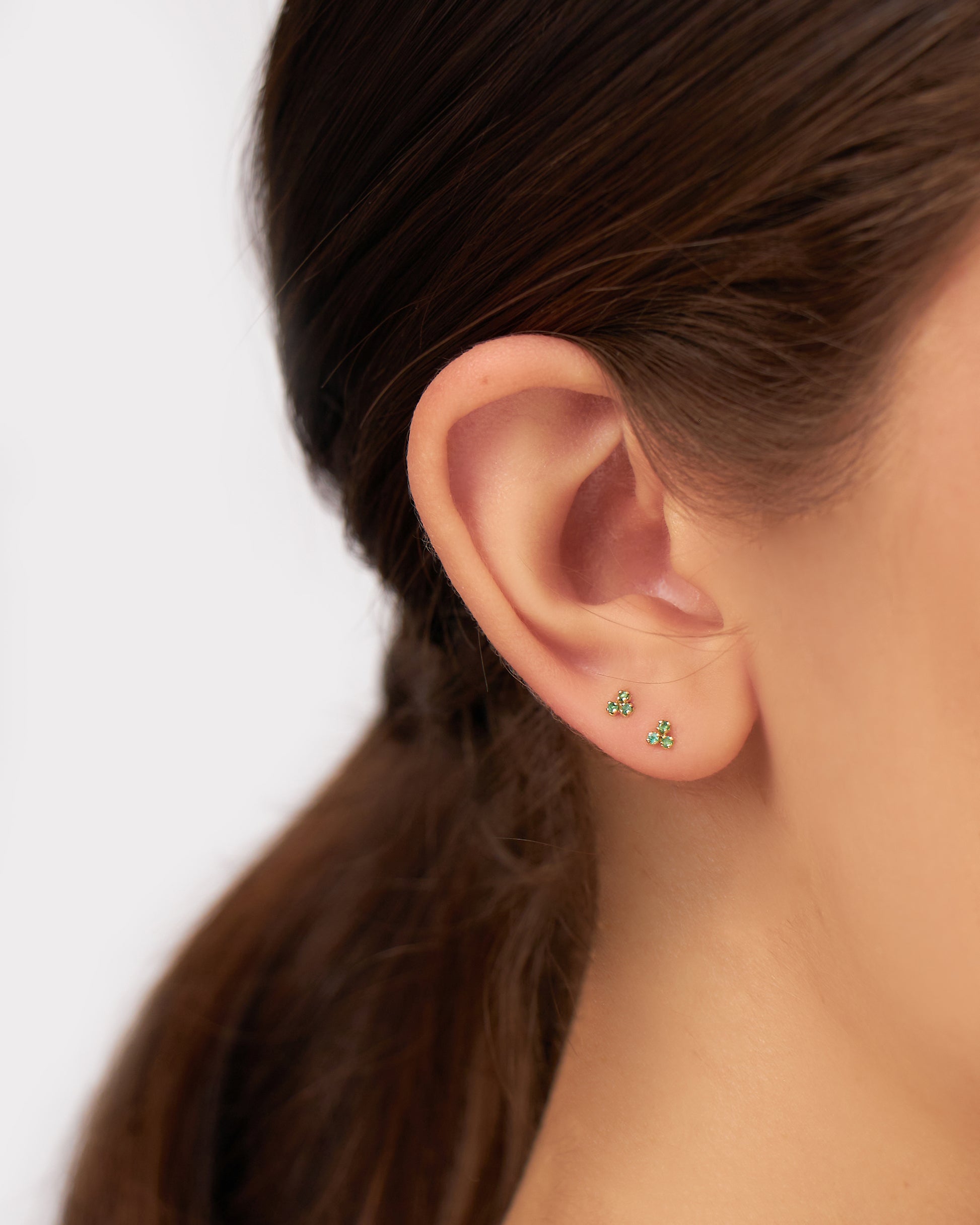 O Brinco Tin Petit é confeccionado em Ouro Amarelo 18K e Esmeraldas de 1,2mm - e cada pé possui 3mm.