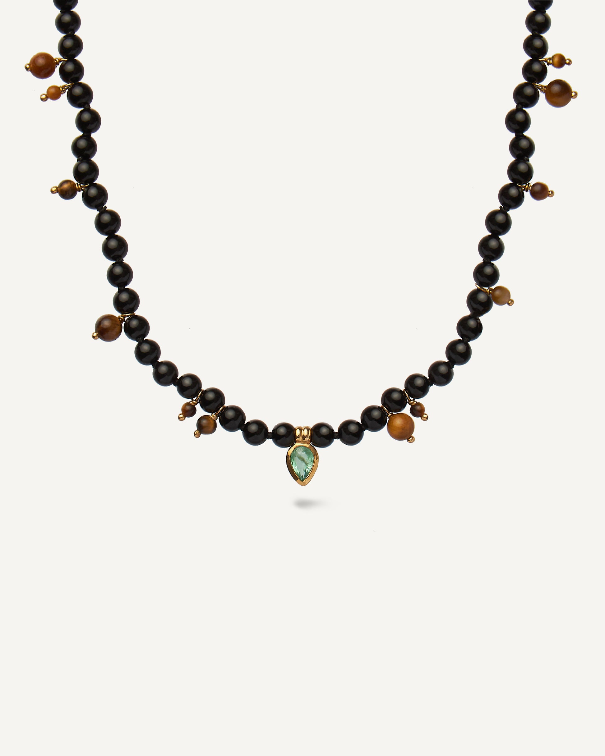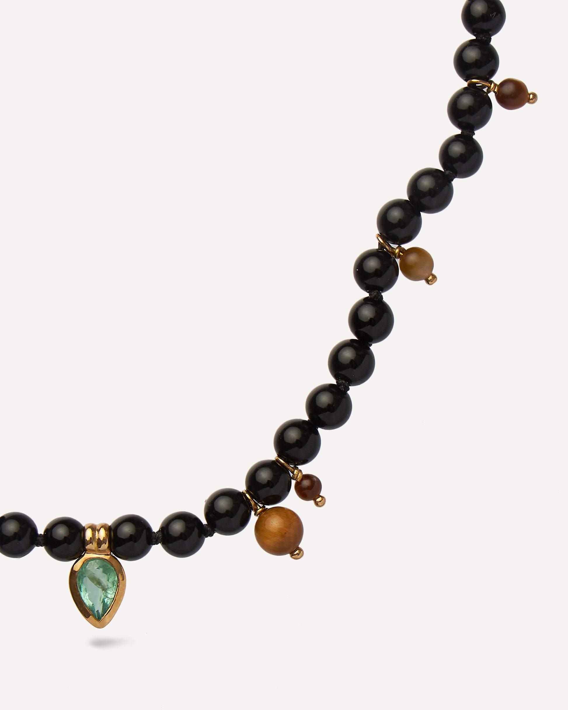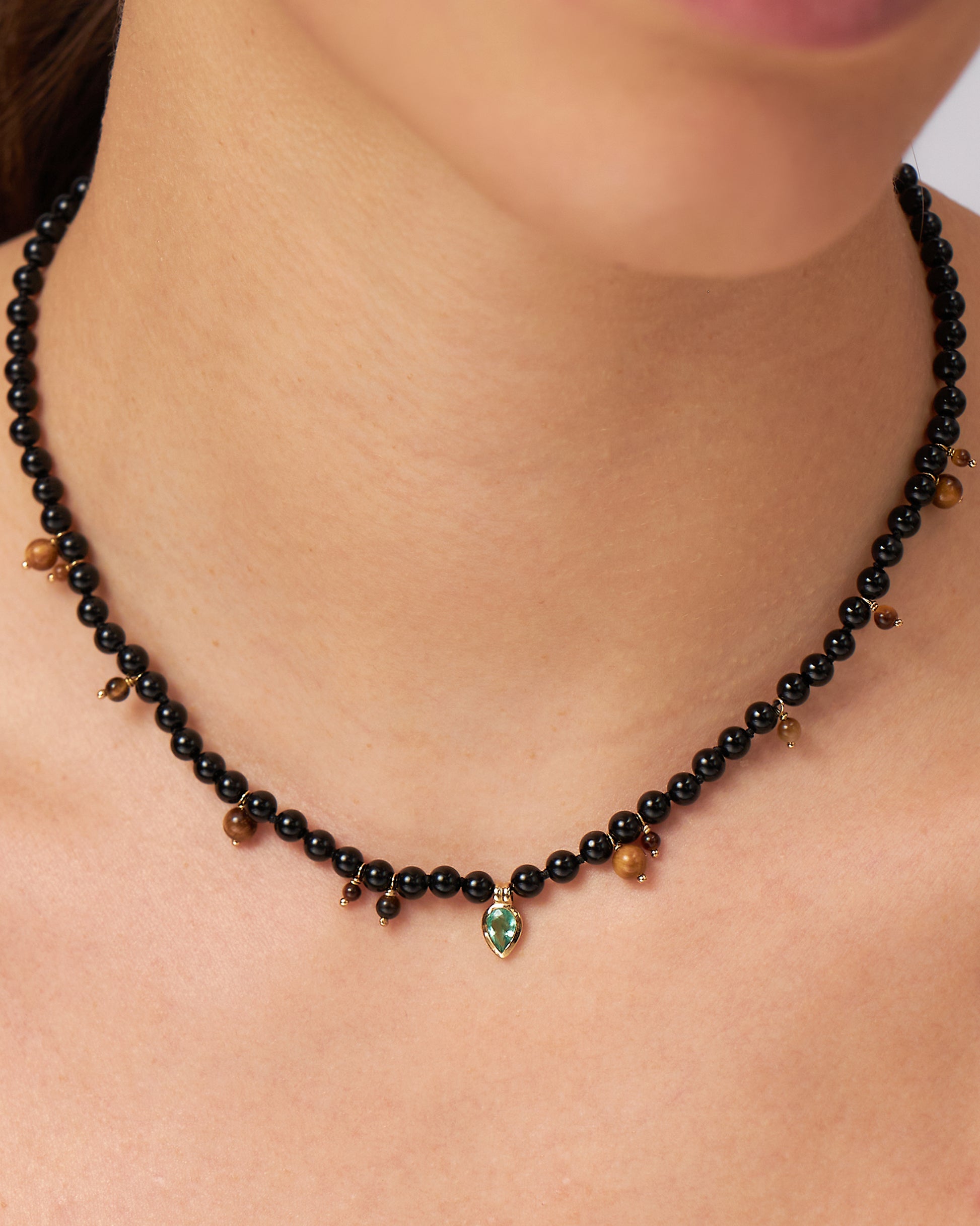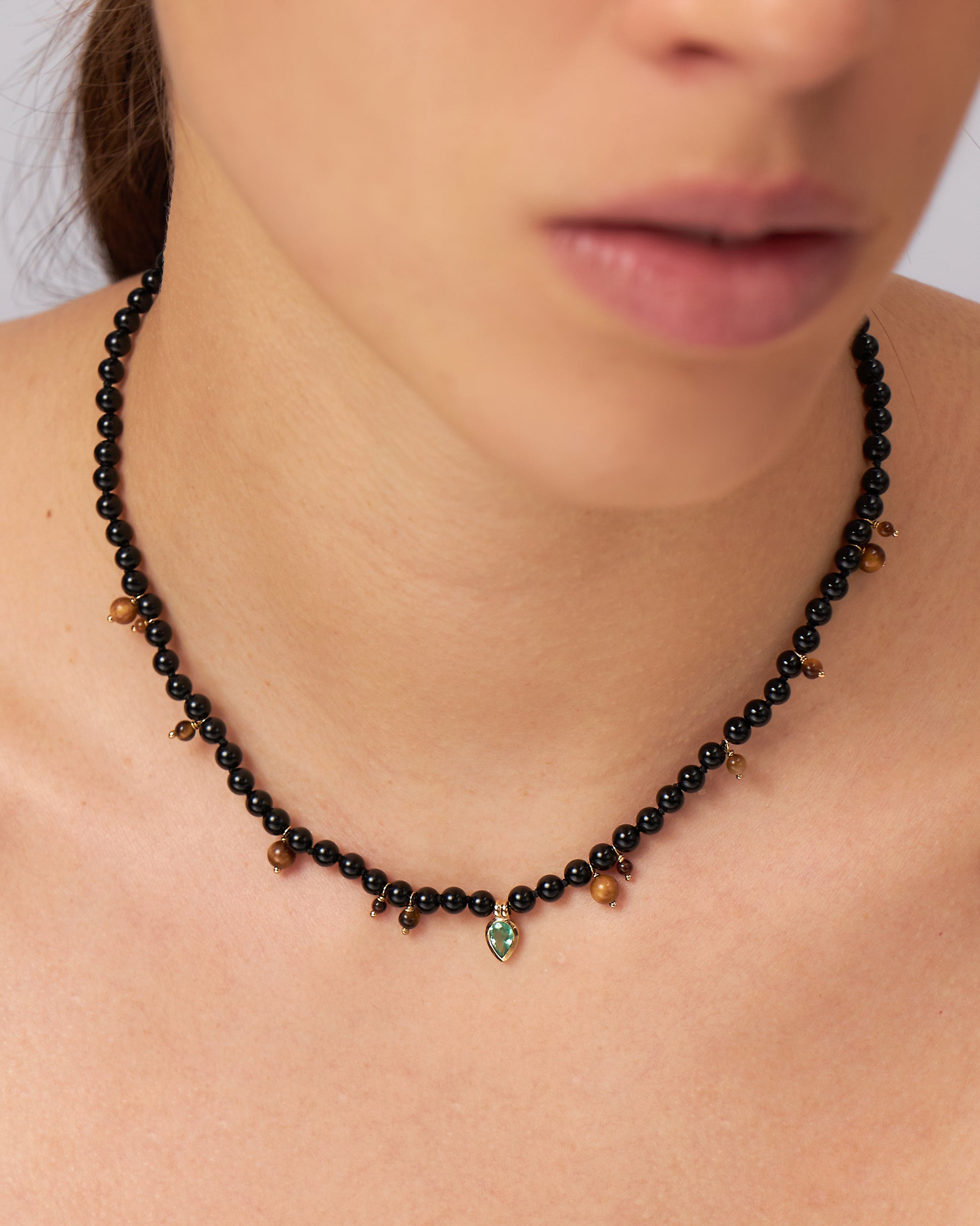 O Colar Alexandria é confeccionado em Ouro Amarelo 18K e Esmeralda em gota de 4x6mm. A corrente é composta por fios de Ônix de 4mm e Olhos de Tigre de 2mm, 3mm e 4mm.