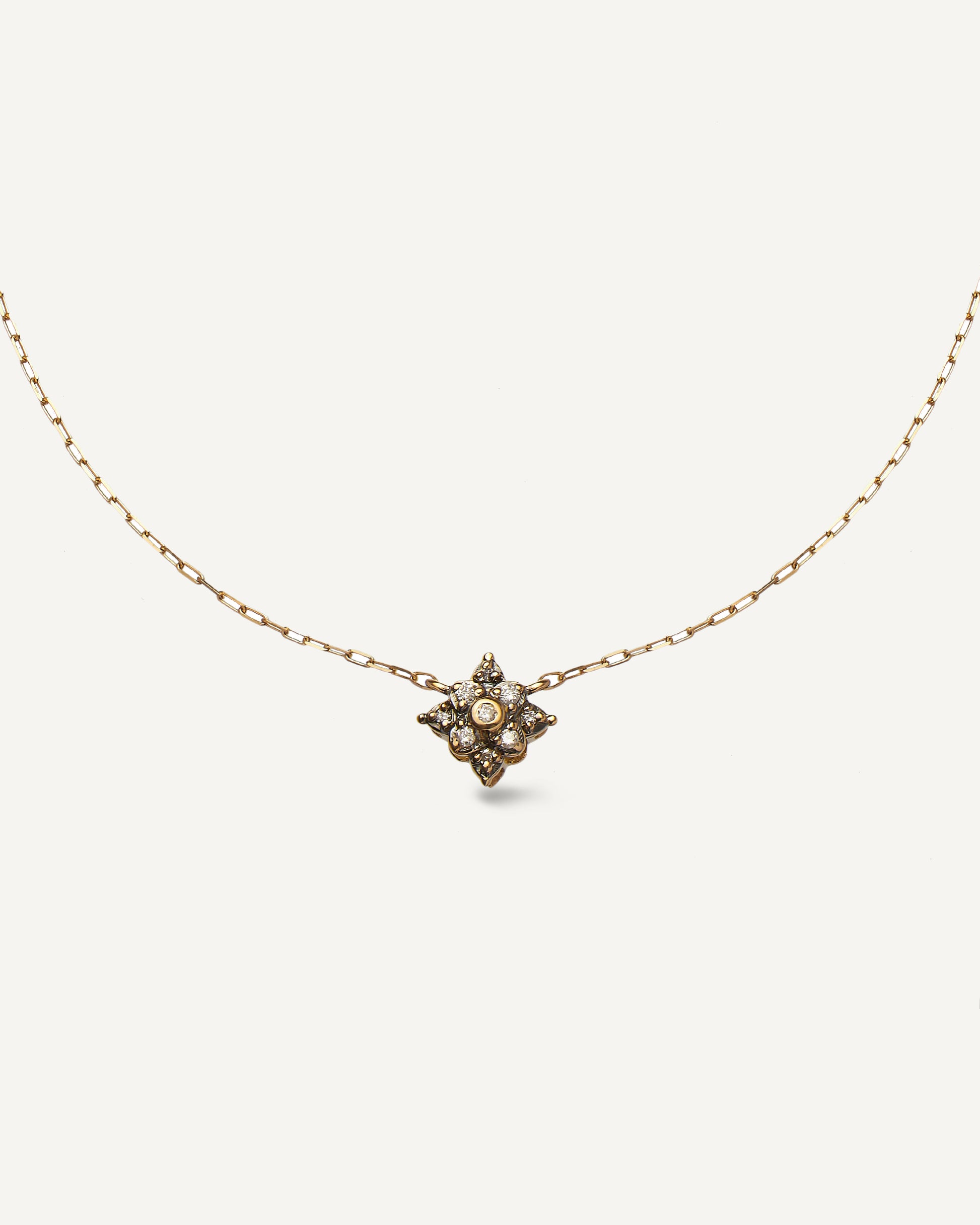 O Colar Antico é confeccionado em Ouro Amarelo 18K e seu pingente central possui 5 Diamantes Brancos de 1 ponto cada e 4 Diamantes Brancos de 0,5 ponto, além de detalhes em ródio negro. O berloque tem 8x8mm e sua corrente tem 40cm ao todo, com elos de ajuste no 37 e 34cm.