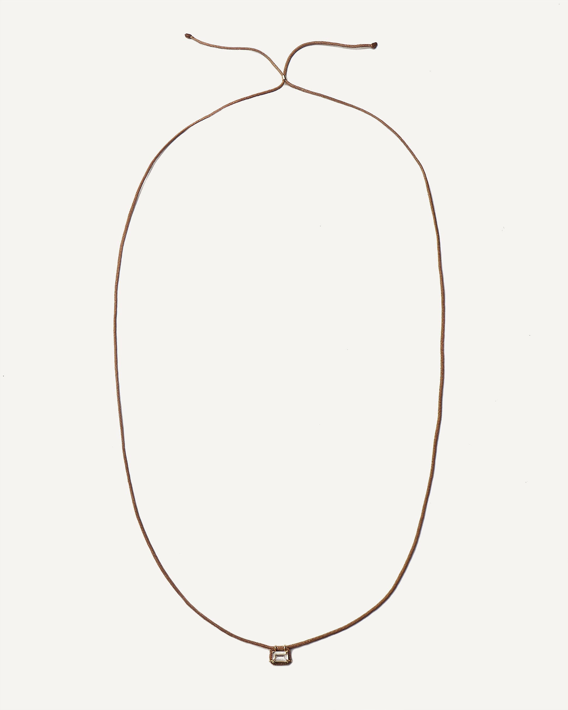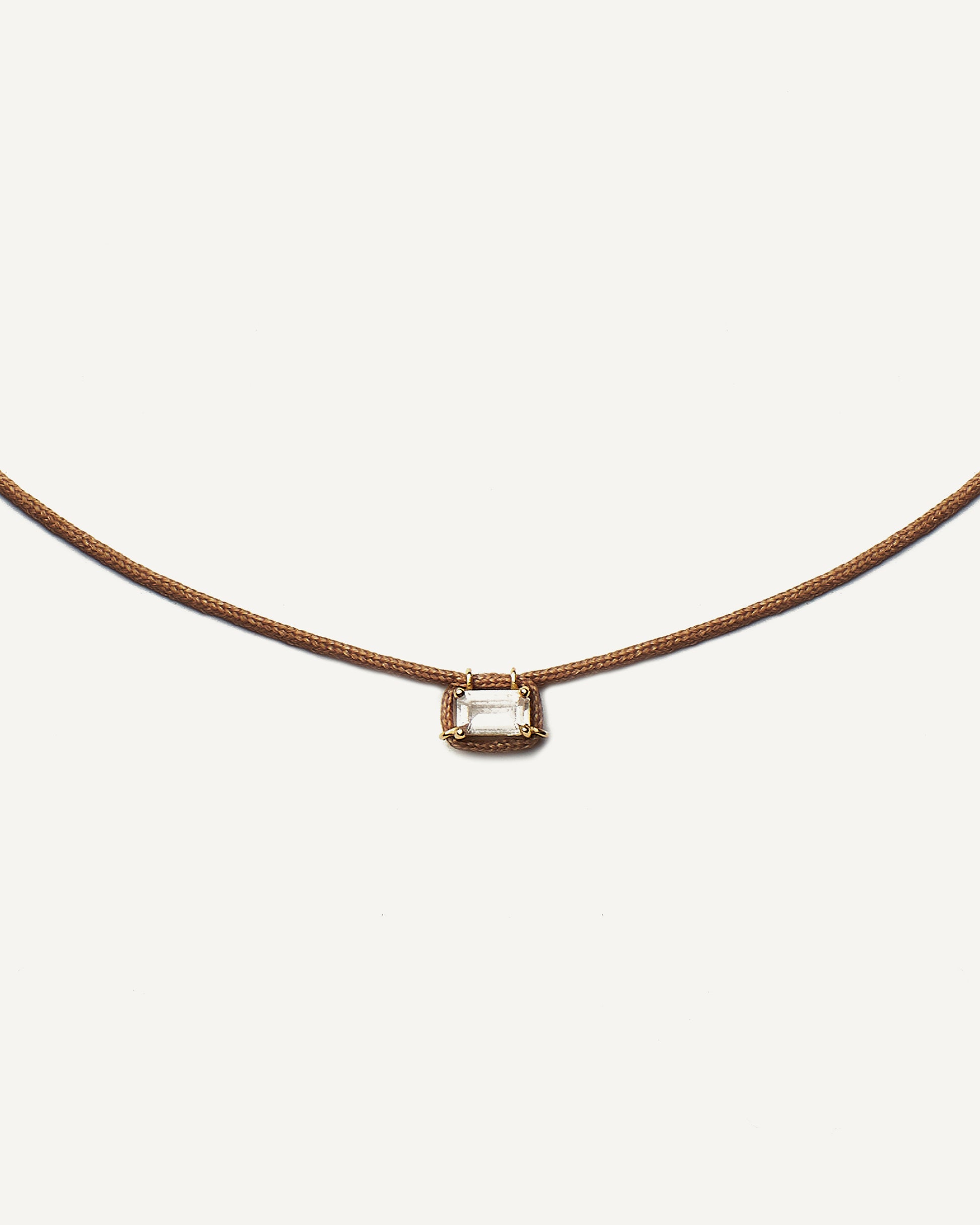 O Colar Cord Nora Areia é confeccionado em Ouro Amarelo 18k. Sua corda em fio de nylon (resistente) tem 70cm com e é ajustável com uma charneira no final (passa pela cabeça sem necessitar abrir e fechar). A peça possui uma Safira Branca octogonal de 3x5mm.