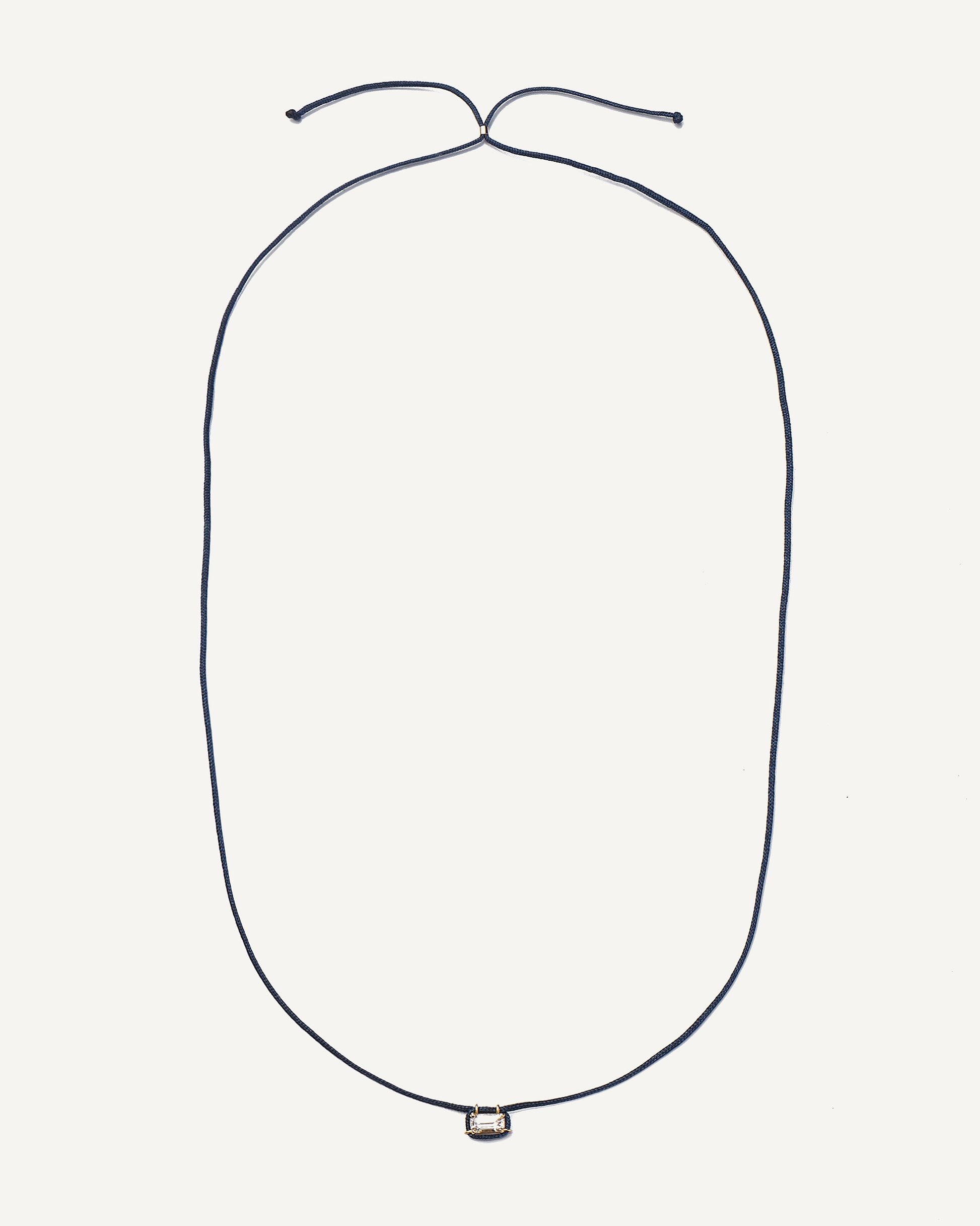O Colar Cord Nora Azul é confeccionado em Ouro Amarelo 18K. Sua corda em fio de nylon (resistente) tem 70cm com e é ajustável com uma charneira no final (passa pela cabeça sem necessitar abrir e fechar). A peça possui uma Safira Branca octogonal de 3x5mm.
