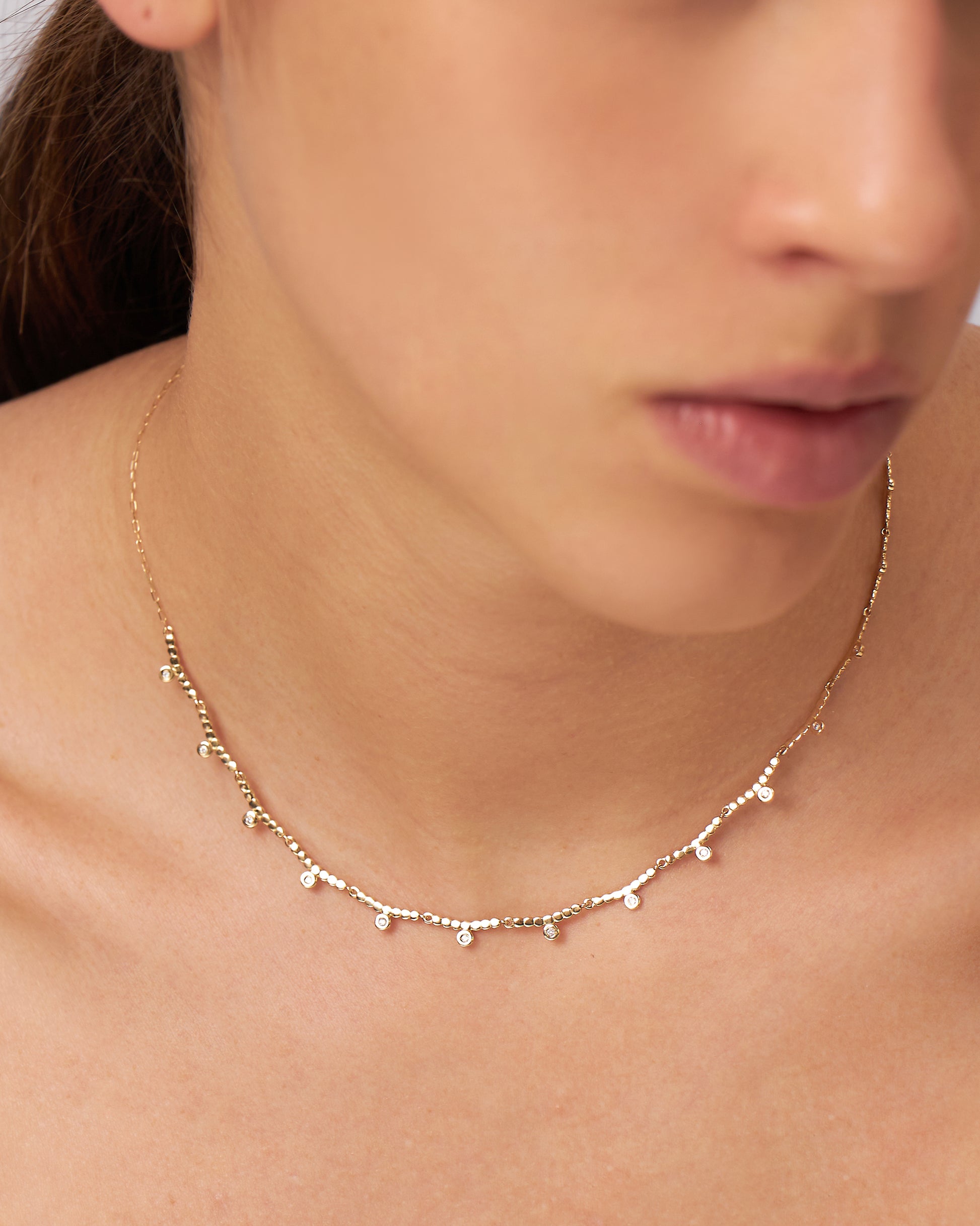 O Colar Nola é confeccionado em Ouro Amarelo 18K e possui 14 pedras de Diamante Branco de 1 ponto cada. A peça é composta por travas curvadas com diamantes, que juntas compõem 19cm da extensão da peça; que ao todo tem 40cm com elos extras para ajuste no 34 e 37cm, o que permite que usá-lo mais justo - como se fosse uma gargantilha.