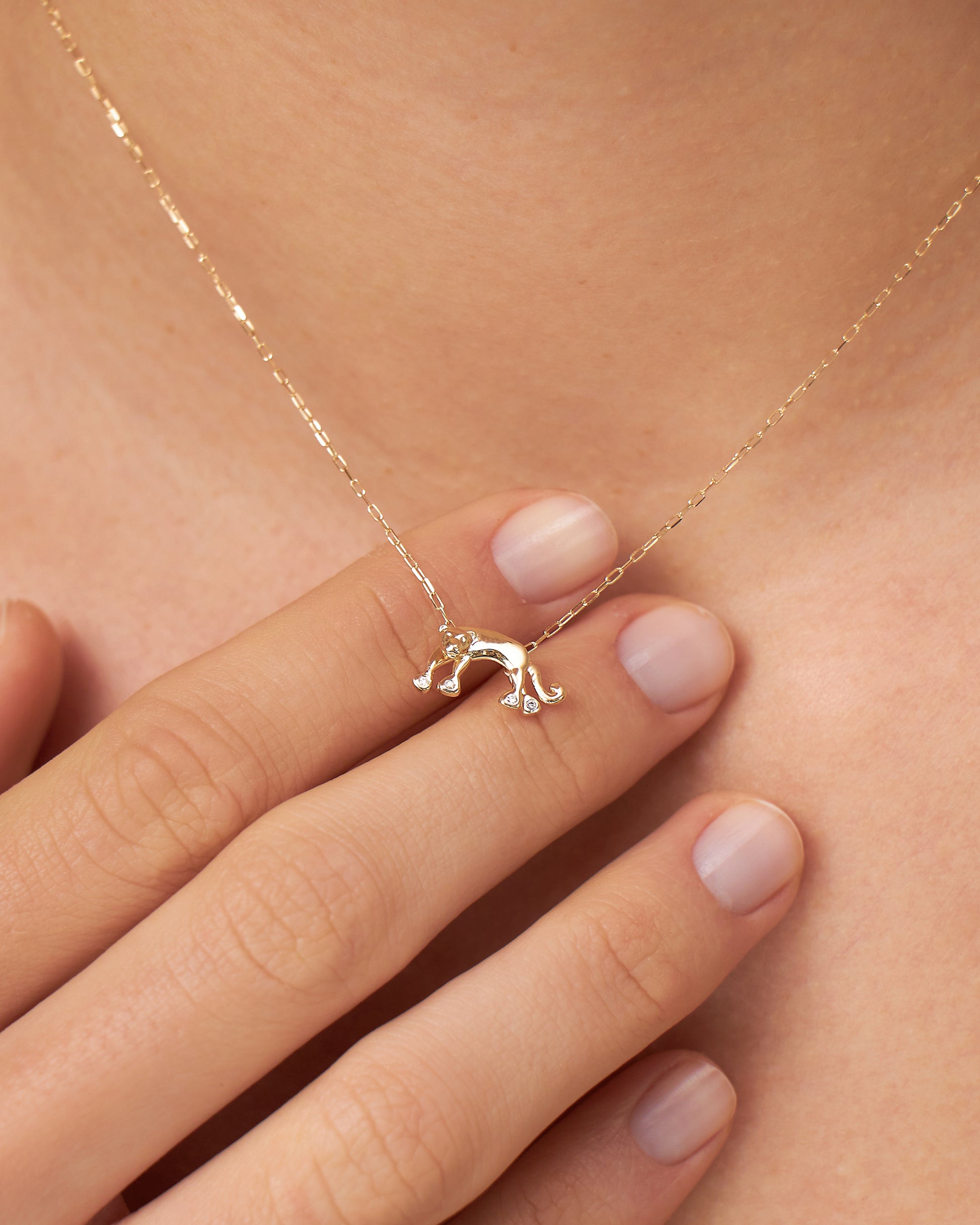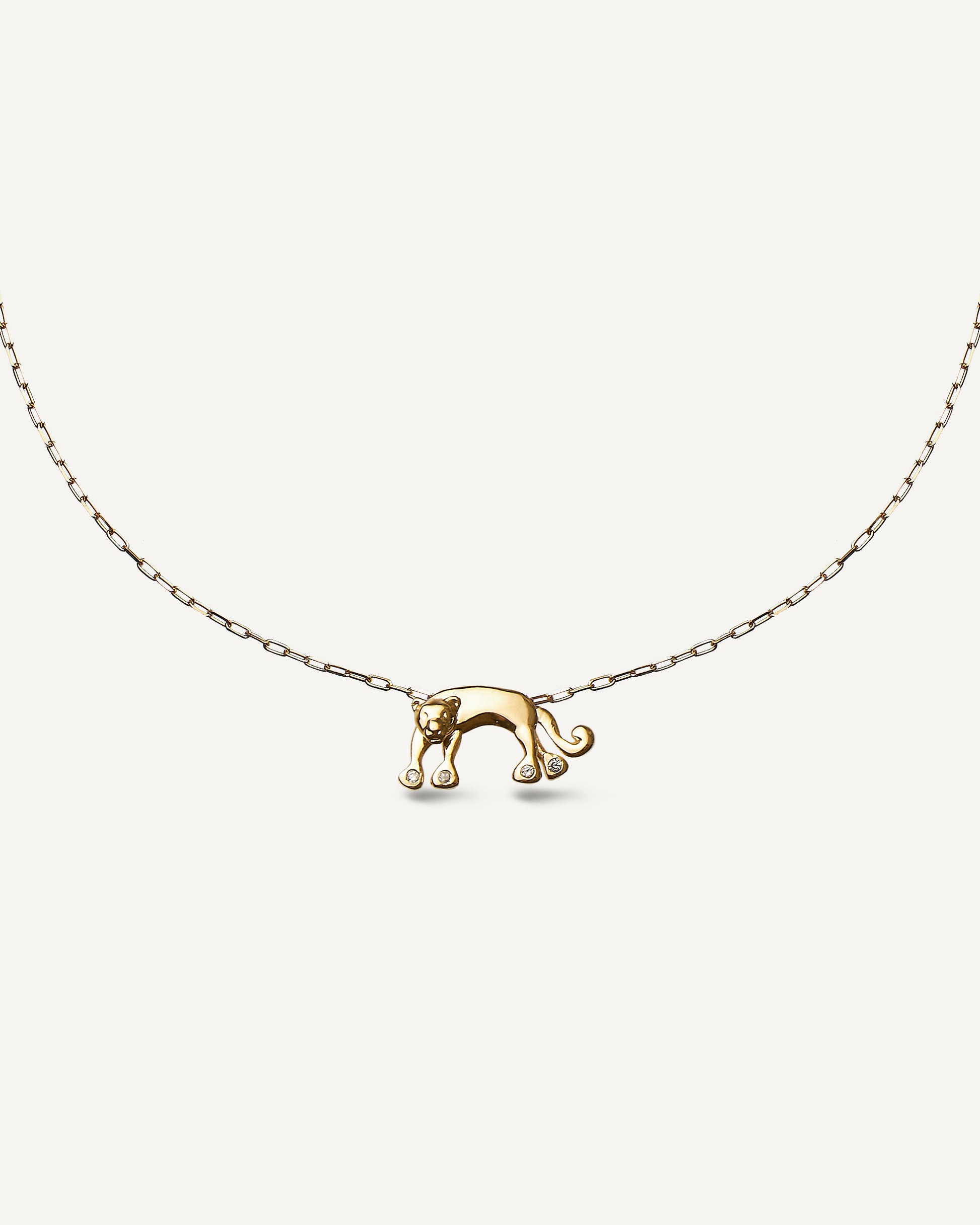O Colar Pantera é confeccionado em Ouro Amarelo 18K e tem quatro Diamantes Brancos de 0,5 ponto cada. Seu pingente em formato de pantera possui 15x7mm e sua corrente 40 cm com elo no 37 e 34, o que permite que use-o mais justo - como se fosse uma gargantilha. Desta forma, você pode criar uma composição de colares no colo, usando alguns mais curtos e outros mais longos.