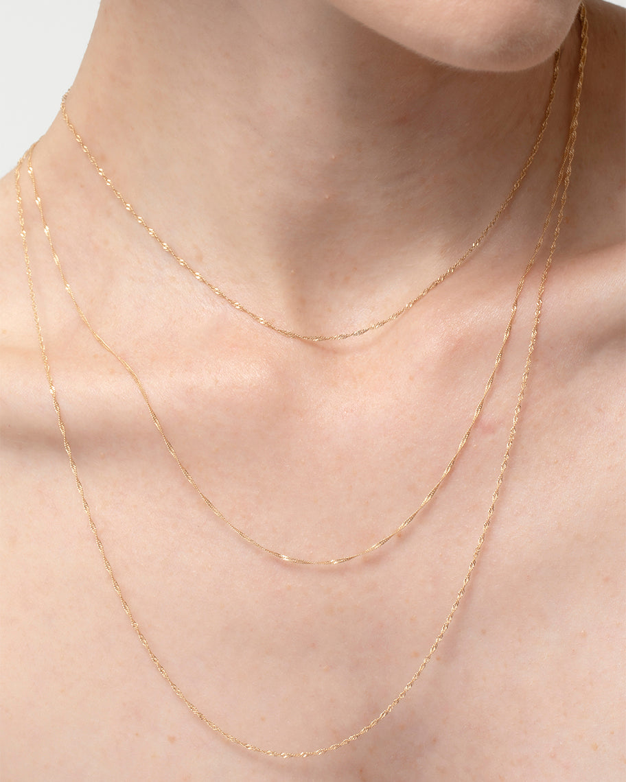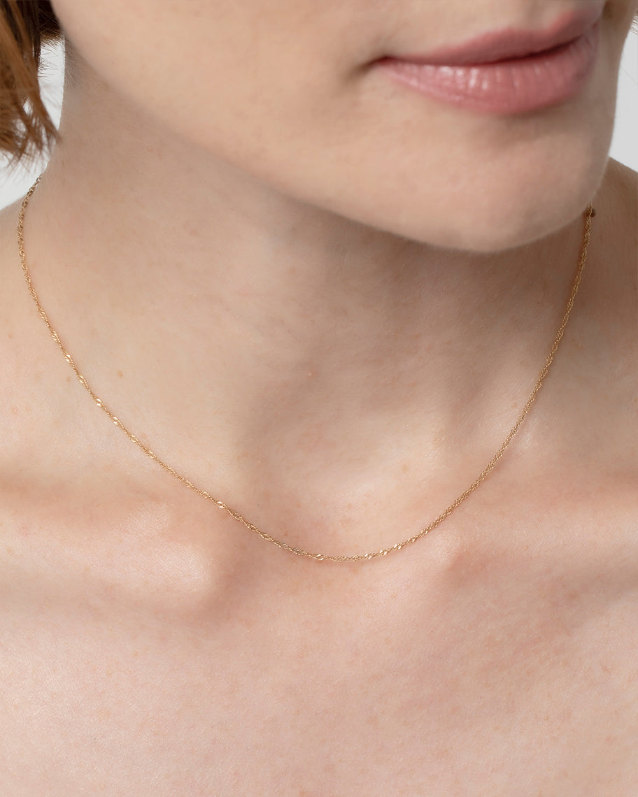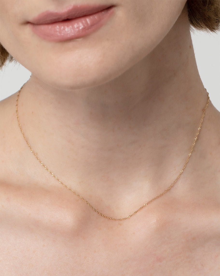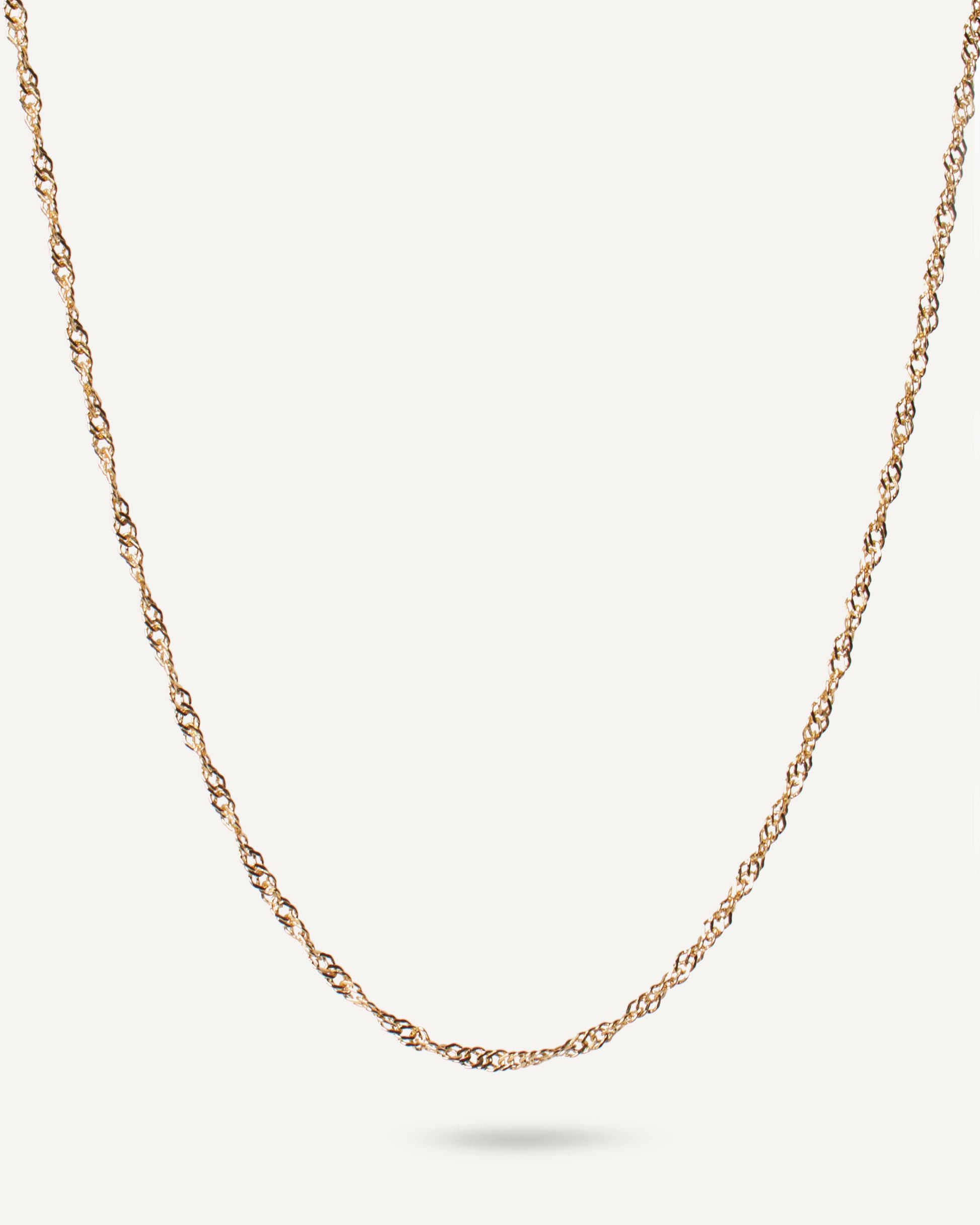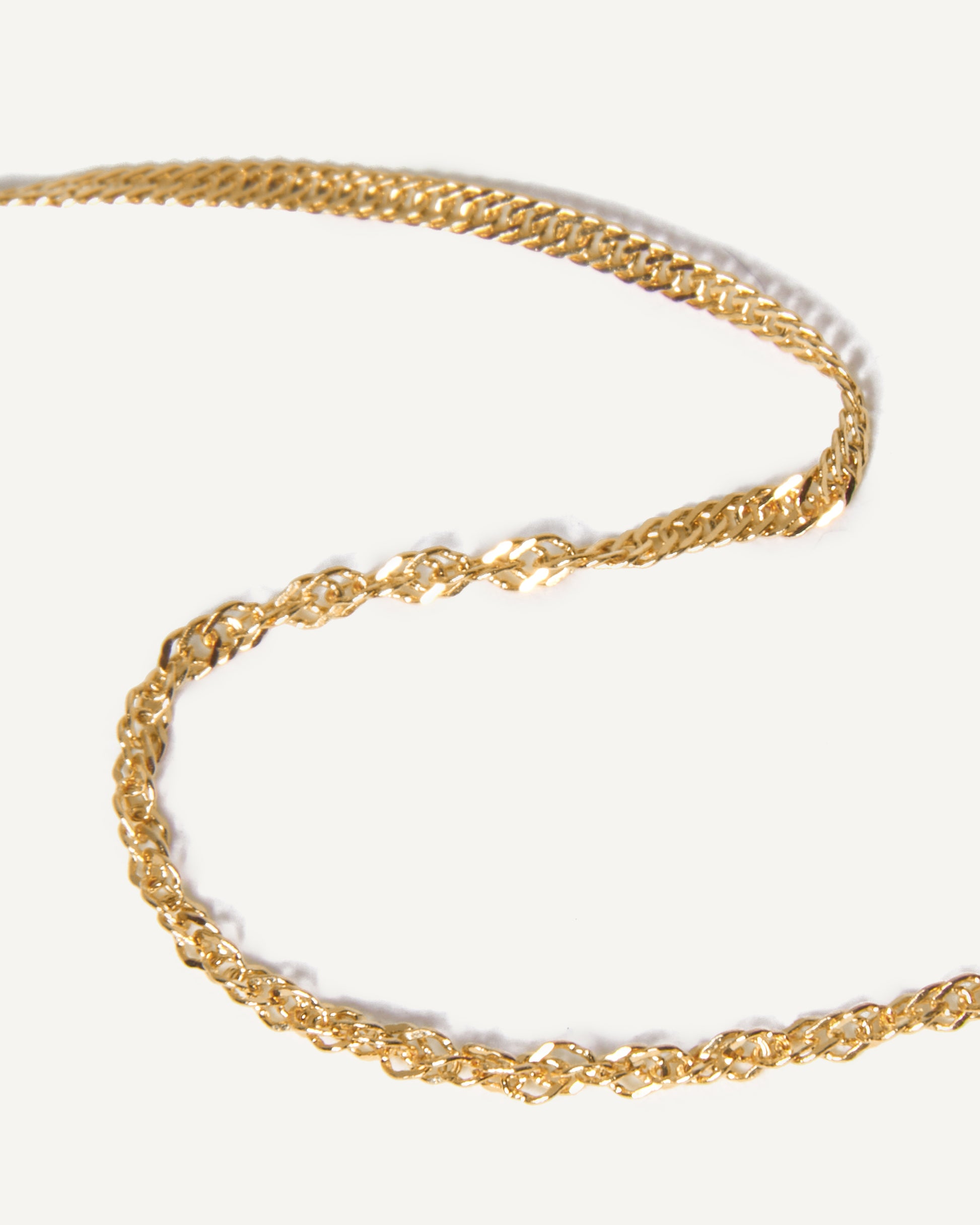 A Corrente Twist é confeccionada em Ouro Amarelo 18K e possui 40cm ao todo. Seu aspecto "torcido", garante à peça um brilho e movimento delicados e únicos.