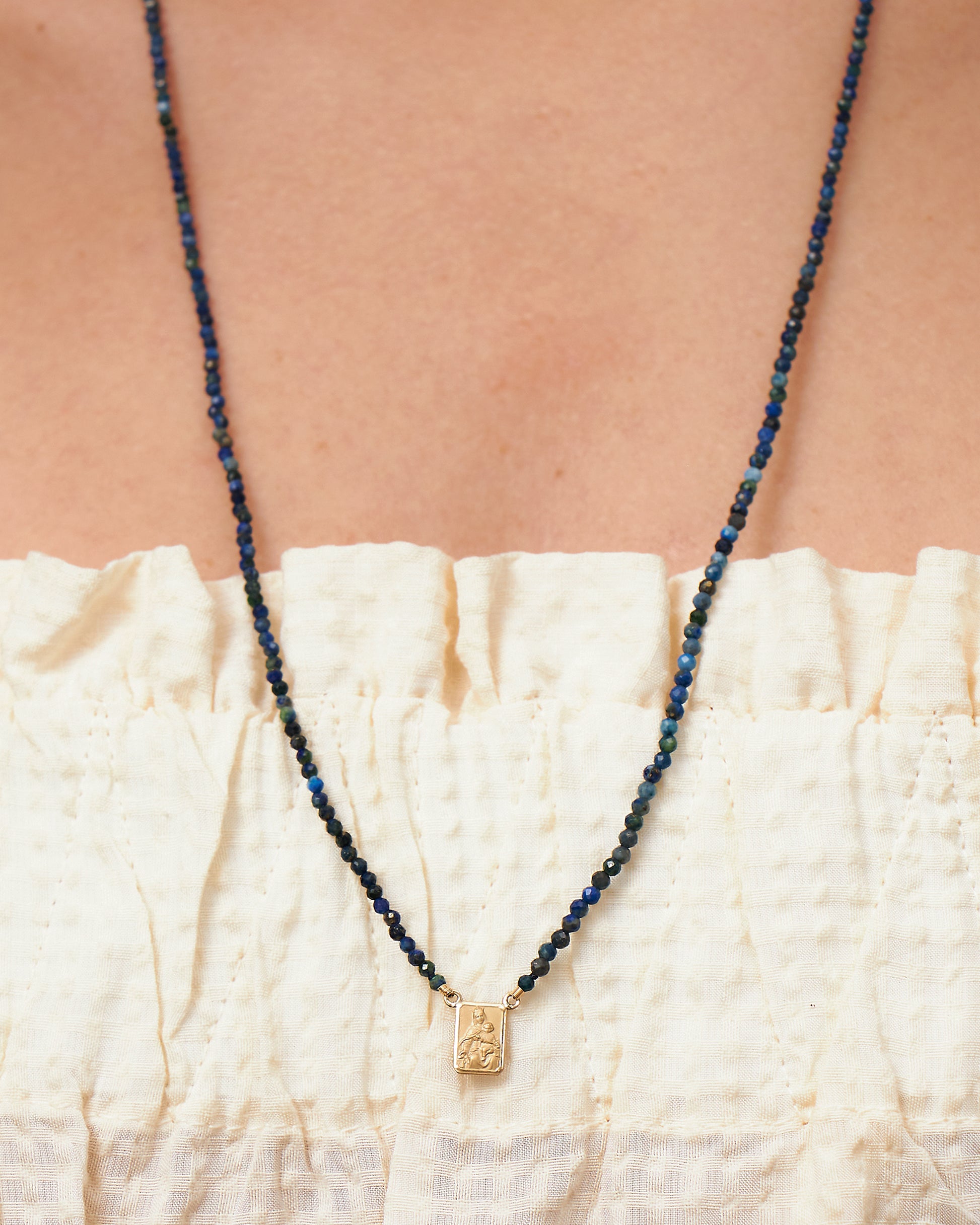 O Escapulário Sacré é confeccionado em Ouro Amarelo 18K e Lápis-lazúlis de 2mm. O escapulário possui 70cm, e cada pingente possui 8x6mm. A peça não possui fecho é vestida passando pela cabeça.