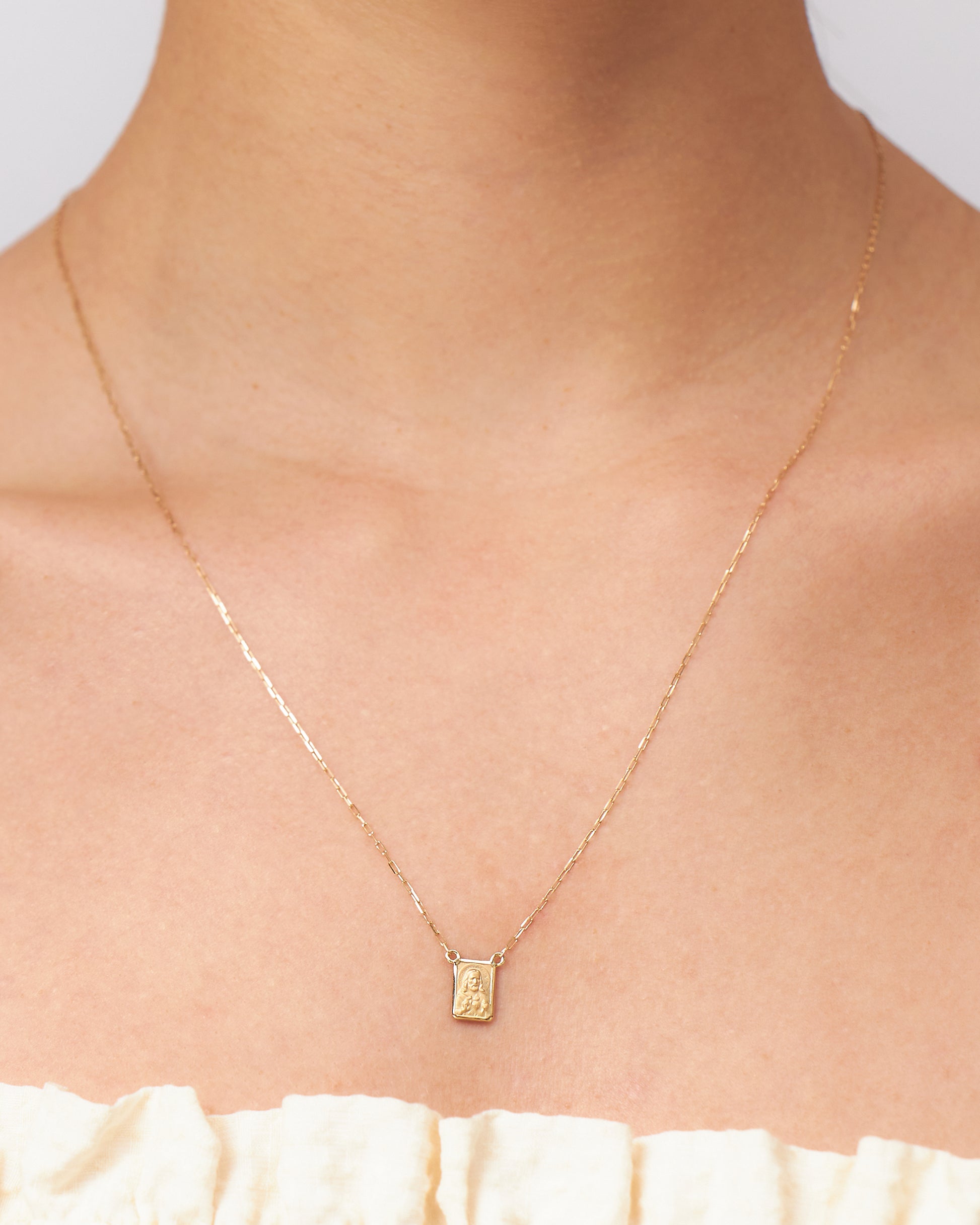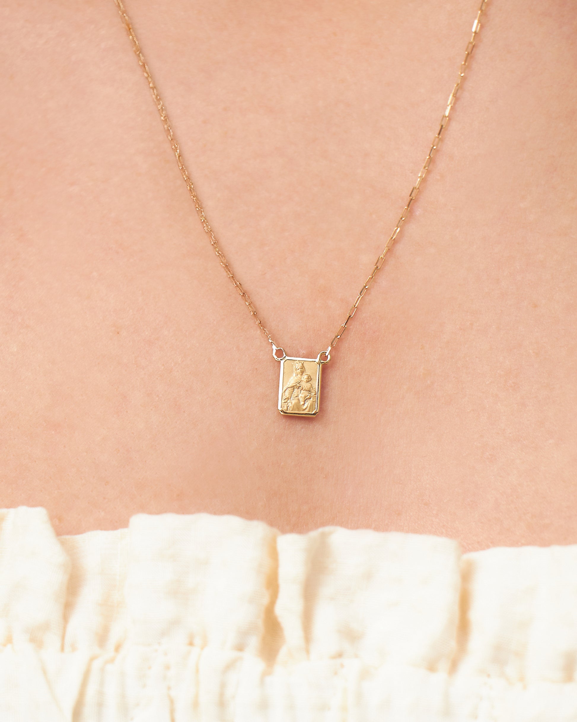 O Escapulário Sacré é confeccionado em Ouro Amarelo 18K, possui 60 cm de corrente e cada pingente possui 8x6mm. A peça não possui fecho é vestida passando pela cabeça.