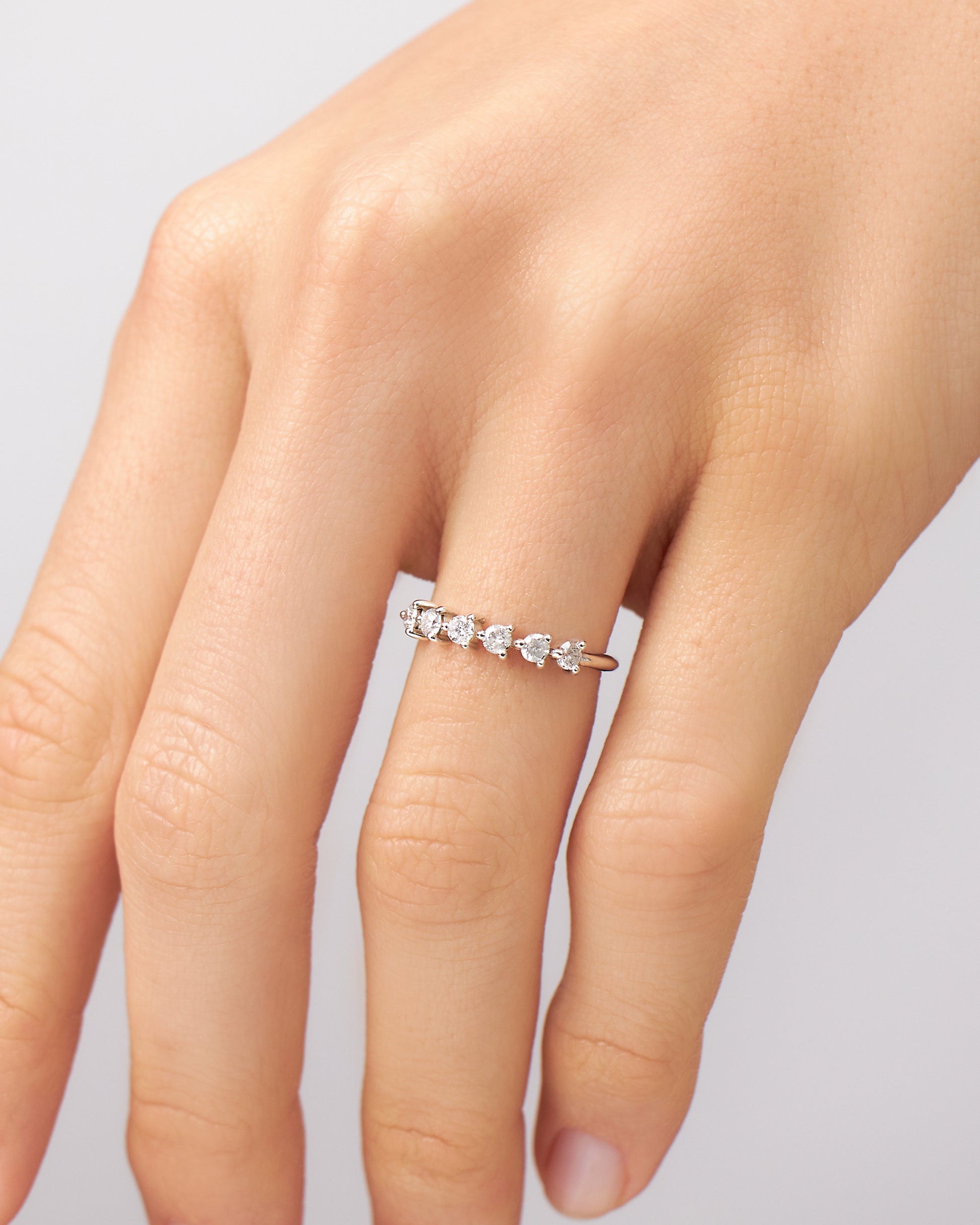 A Meia Aliança Eternal é confeccionada em Ouro Branco 18K e 6 pedras de Diamante Branco de 6 pontos (2,5mm). A espessura do aro do anel é de 1,7mm.