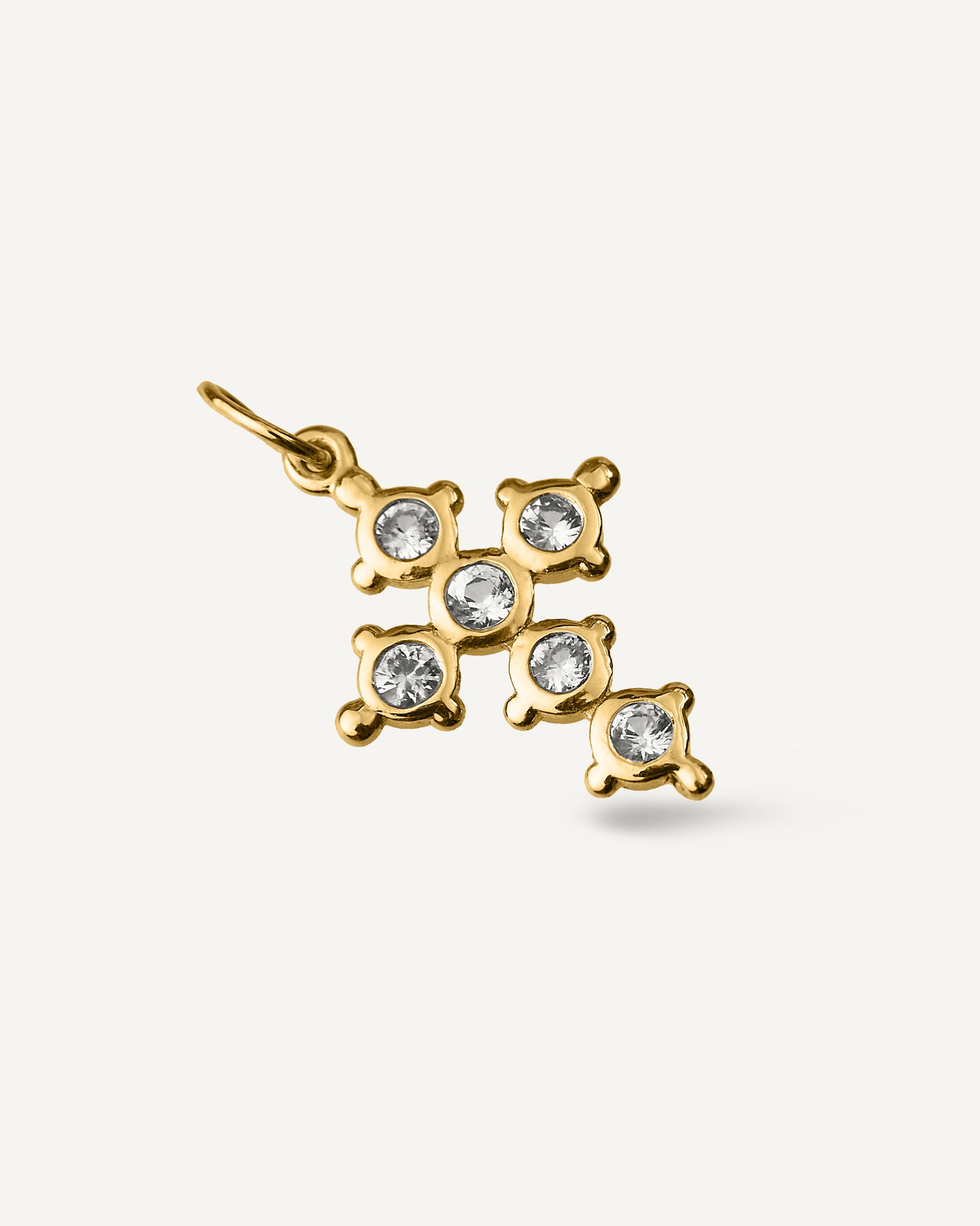 O Pingente Cruz Sacré é confeccionado em Ouro Amarelo 18K e 6 Safiras Brancas de 1,7mm cada - A cruz tem aproximadamente 20x12mm.