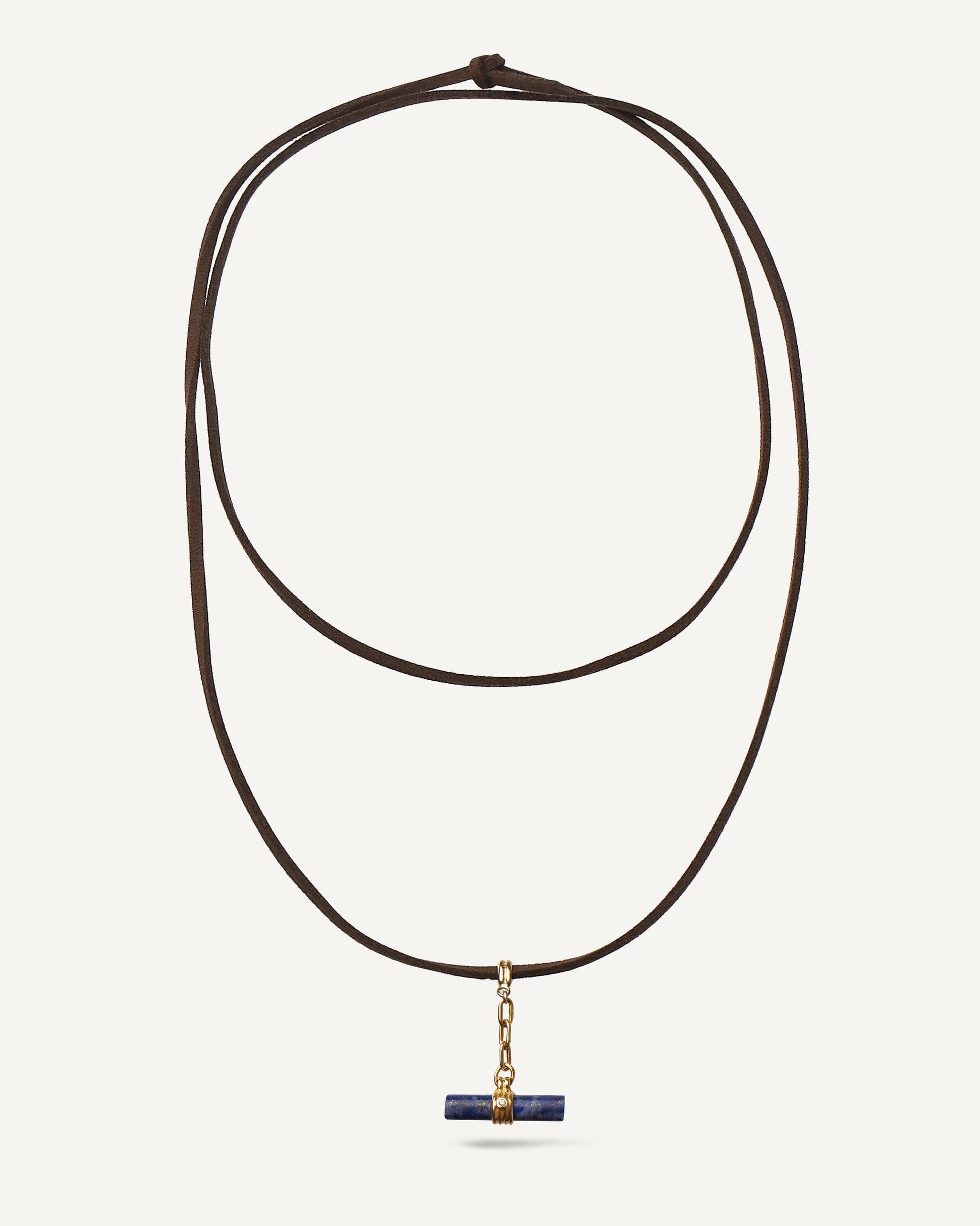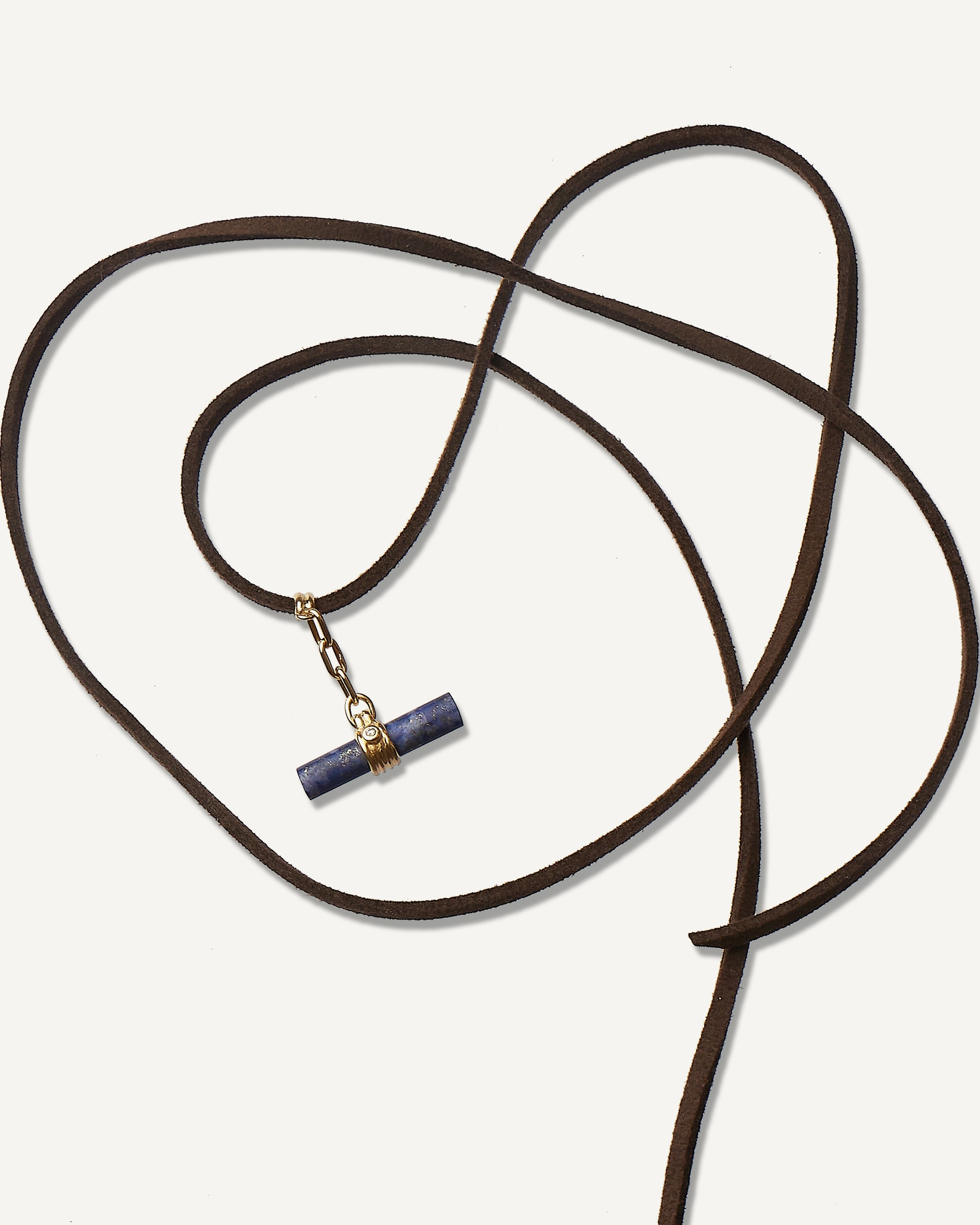 O Pingente Nilo é confeccionado em Ouro Amarelo 18K e Lápis-Lazúli lapidado em formato de tubo de 20x4,5mm com uma pedra de Diamante Branco de 1 ponto. O pingente possui aproximadamente 20x30mm e acompanha camurça marrom de 90cm (pode ser usado em qualquer outra corrente).