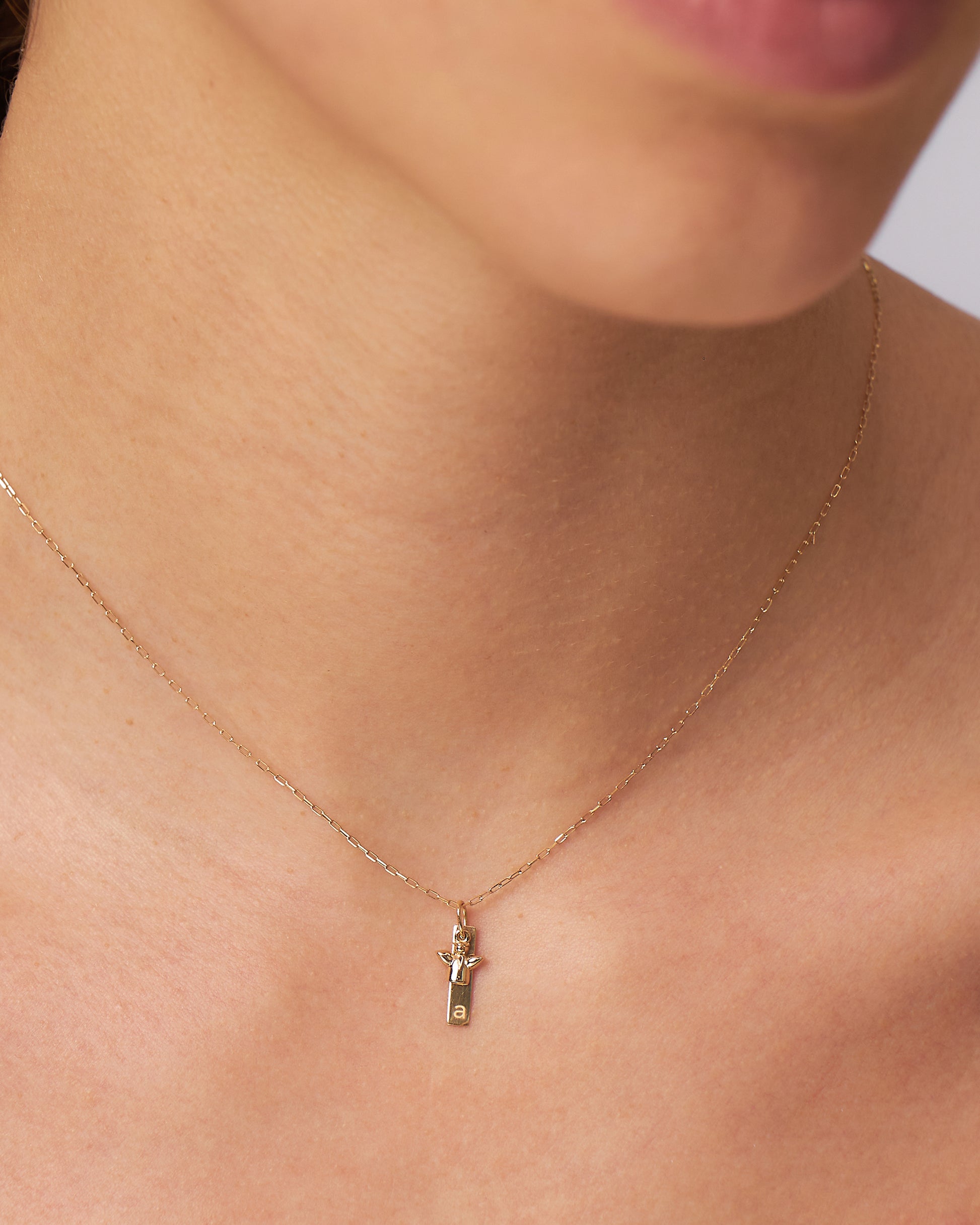 O Pingente Placa Inicial Anjo da Guarda é confeccionado em Ouro Amarelo 18k. Sua placa possui aproximadamente 3x13mm e o anjo 5x4mm. A peça é personalizável, avulsa e não acompanha corrente.