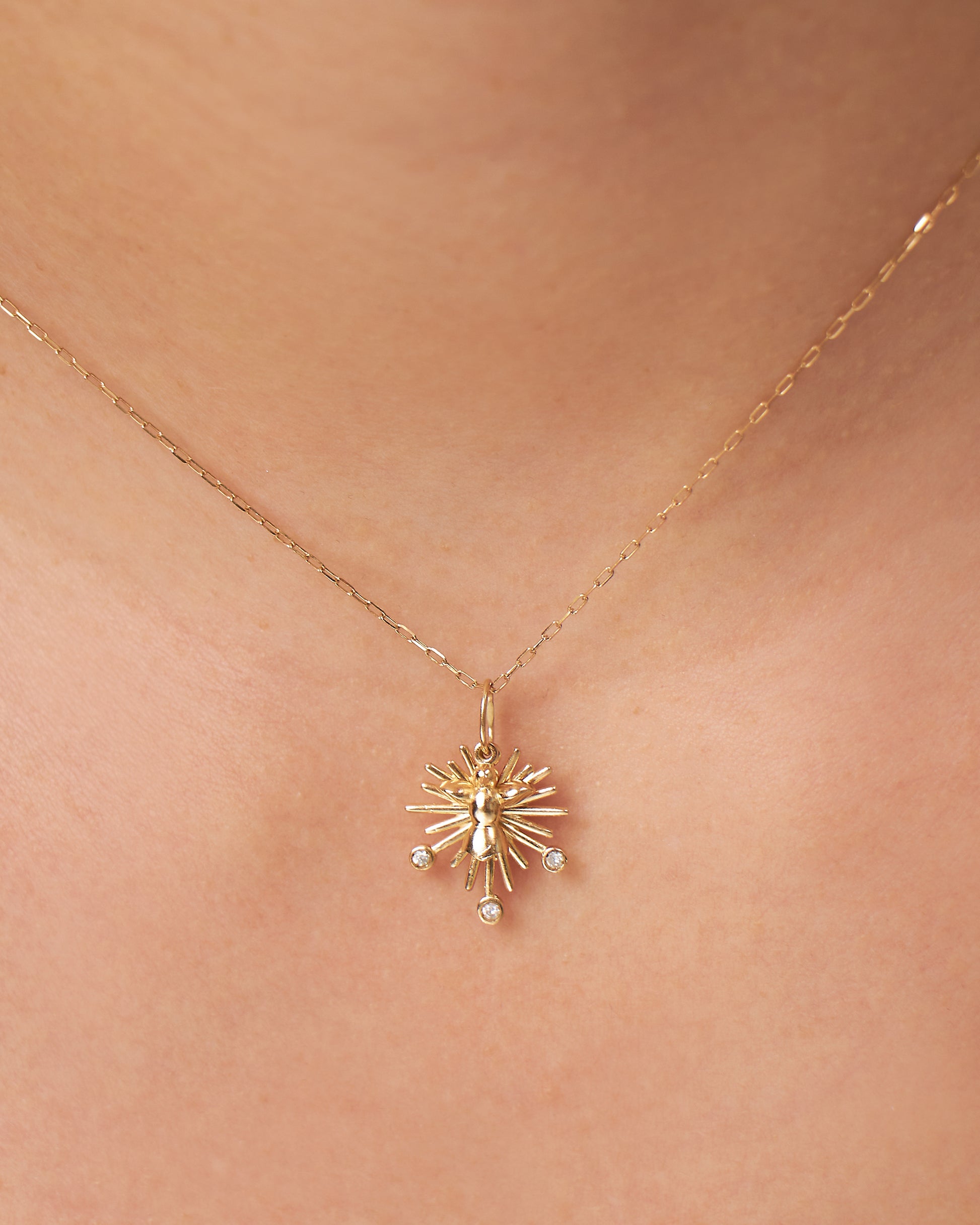 O Pingente Sagrado Espirito Santo é confeccionado em Ouro Amarelo 18K e possui três Diamantes Brancos de 0,5 pontos cada. A peça tem aproximadamente 15x15mm.
