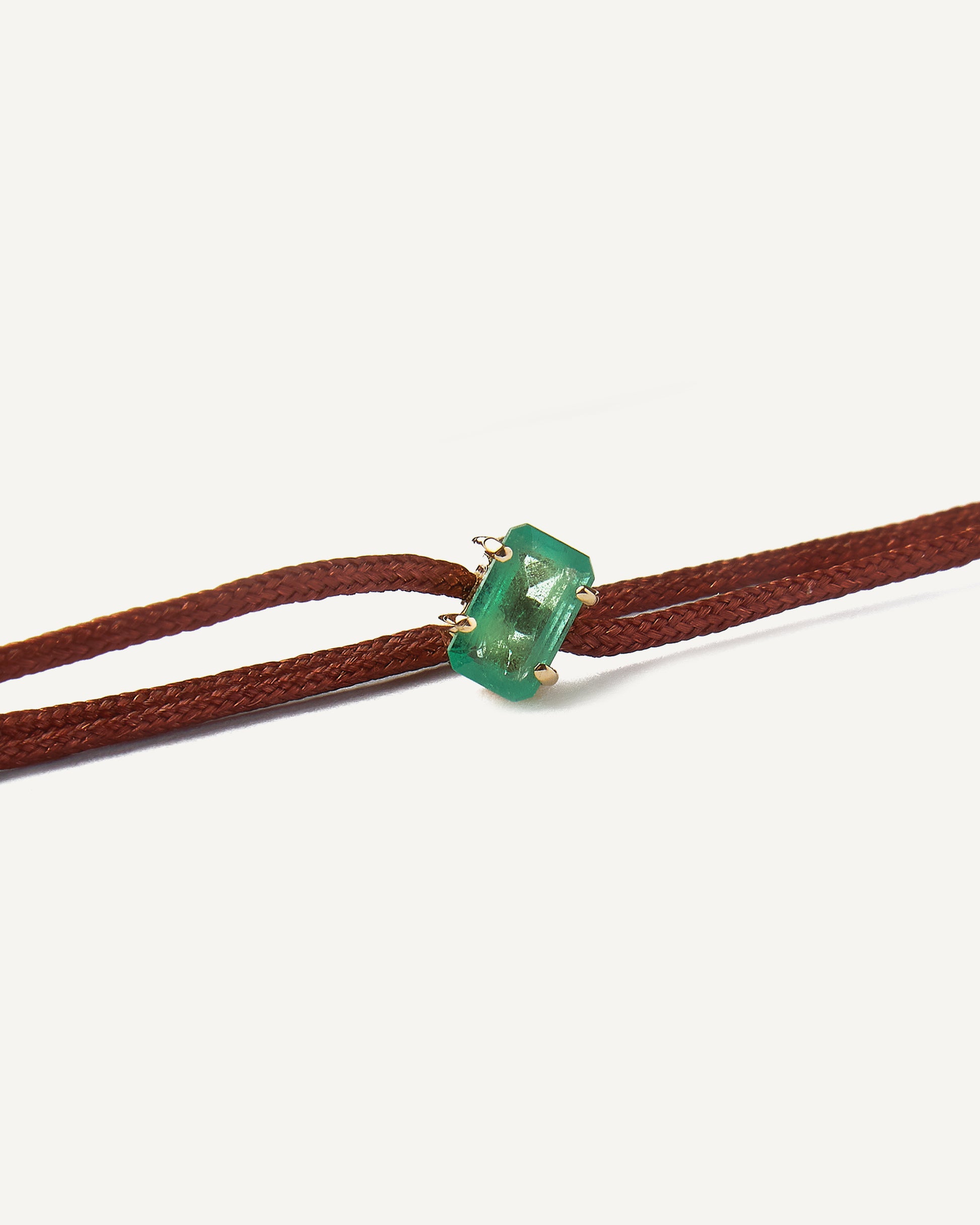 A Pulseira Cord Esmeralda é confeccionada em fio de nylon e possui um pingente central com Esmeralda octogonal 3x5mm. O pingente percorre pelo cordão, que dá de 4 a 5 voltas no pulso e o fechamento é feito com uma pequena charneira de ouro.