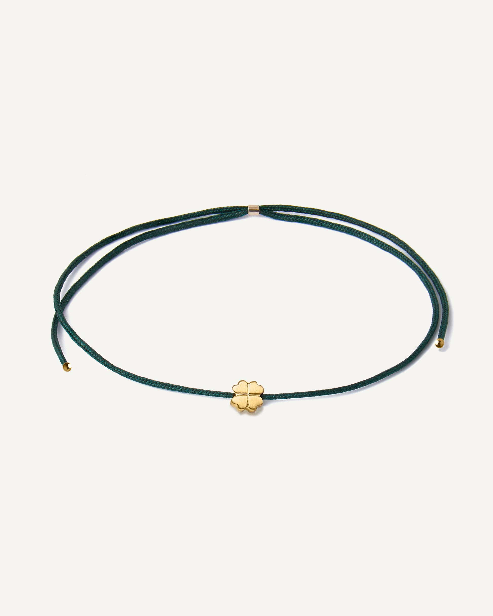 A Pulseira Cord Trevo é confeccionada em fio de nylon verde e possui um pingente em formato de trevo de 4x4mm. Ele percorre pelo cordão e o fechamento é dado com uma charneira que pode ajustar o tamanho da pulseira no pulso. A peça faz parte da collab desenvolvida com Nathalia Medeiros.