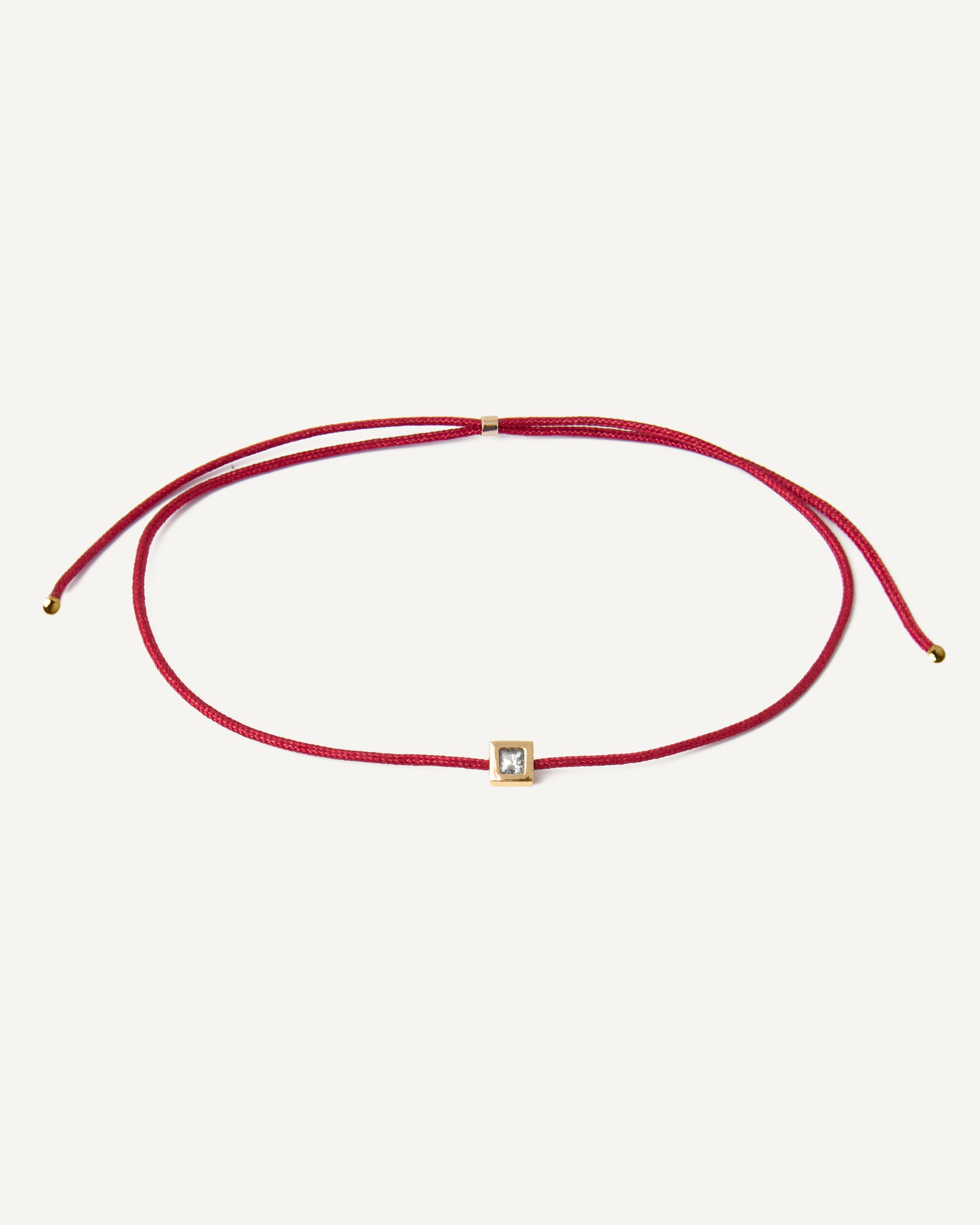 A Pulseira Cord Vermelha é confeccionada em fio de nylon e possui pingente com um carré de Safira Branca de 2x2mm. O pingente percorre pelo cordão e o fechamento é com uma charneira que pode ajustar o tamanho da pulseira no pulso.
